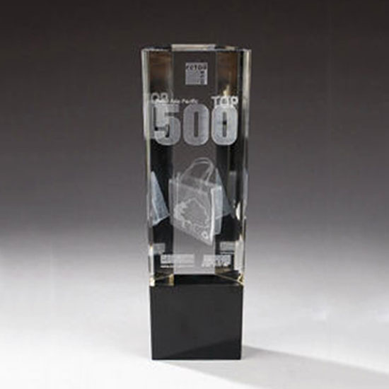 This is a crystal trophy with a stylish and fashionable design. It comes with a 3D inner laser for a unique touch. This crystal trophy is made with great craftsmanship and delicate details.