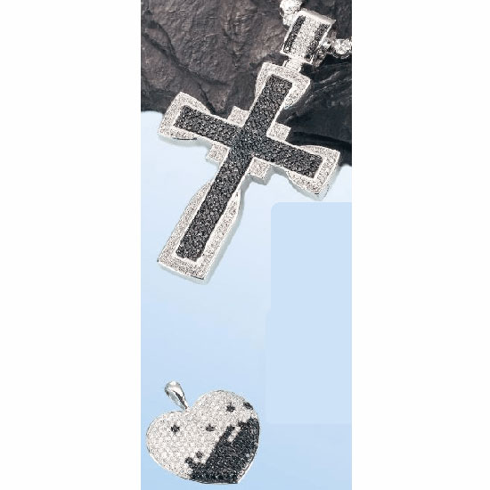 Displayed here is a set of pendants that comes with a cross and a heart designs. They are encrusted with black and white cubic zirconia stones for added glamor. This cubic zirconia pendant set goes well with assorted outfits.