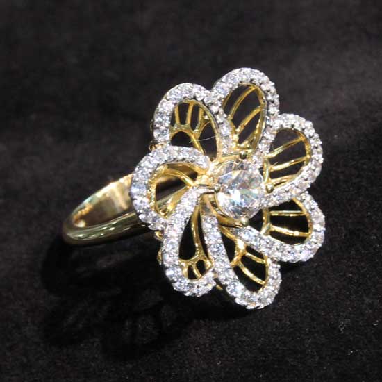 The dainty ladies' ring captures your heart at the first glance with its feminine floral design. Every detail on the floral ring reveals the meticulous craftsmanship completely without reservation. The lustrous gold setting promises an ideal frame for the addition of sparkling cubic zirconia stones. This adorable cubic zirconia ring makes a finishing element for a cute outfit.