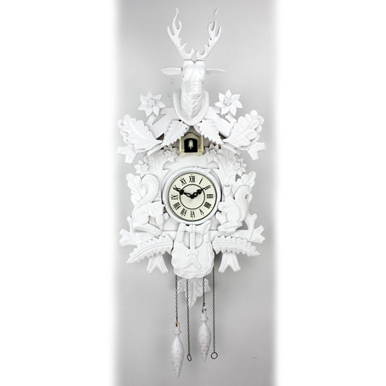 This is a cuckoo wall clock with an elegant and sophisticated design. Its housing features exquisite flower and leaf accents and a deer head on top. This finely designed clock is ideal as a Christmas gift for your friends.
