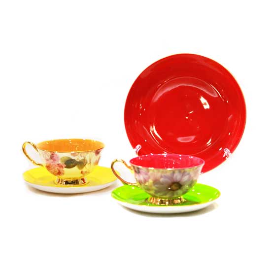 This is a cup and plate set made of high-quality bone china. The set boasts a dainty and charming design in assorted bright colors. The cup features a colored interior, a beautiful exterior with floral patterns, a golden handle, and a golden bottom.