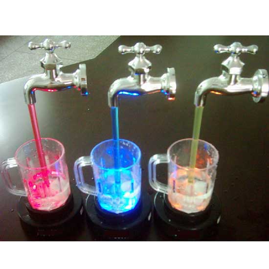 Showcased is a decoration featuring a suspending tap and transparent mug. Color liquid flows from the tap to create an amusing visual effect. This decoration looks stylish in various settings.