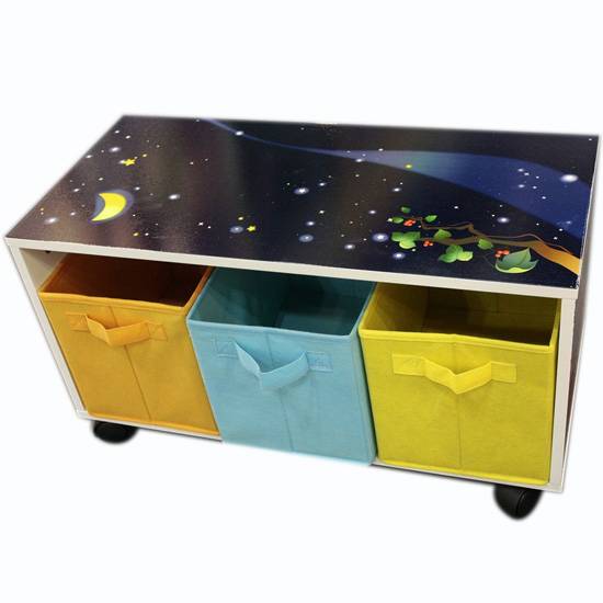 This cupboard features a wheel-design with three removable toy boxes. The cupboard is painted with colorful night patterns to add style to the design. This toy box and cupboard set is the ideal furniture for kindergartens and children's playgroup classes.