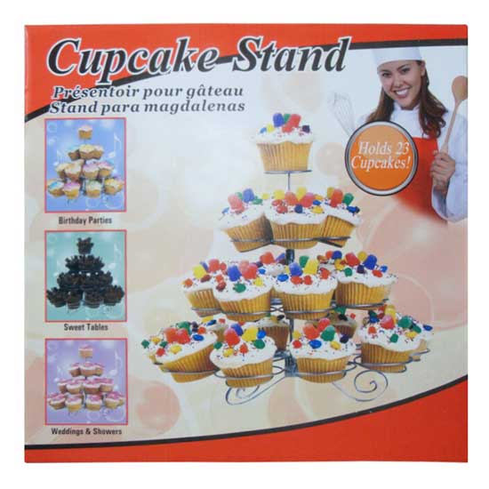 Presented is a cupcake stand that makes a great table decoration in the parties. The cupcake stand is well made of quality metal and polished for an elegant look. It can hold up to 23 cupcakes in total.