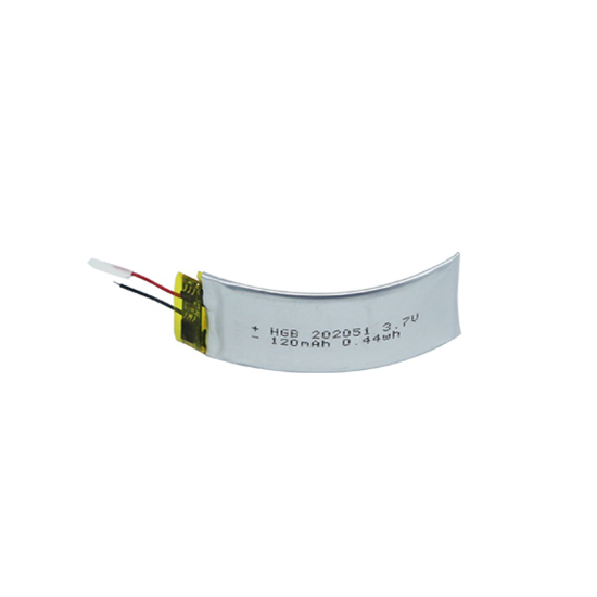 Featured here is a lithium polymer battery with a capacity of 120mAh. It comes in a curved design and has cables on the side for installation. This battery offers a long working life and is ideal for smart bracelets use.