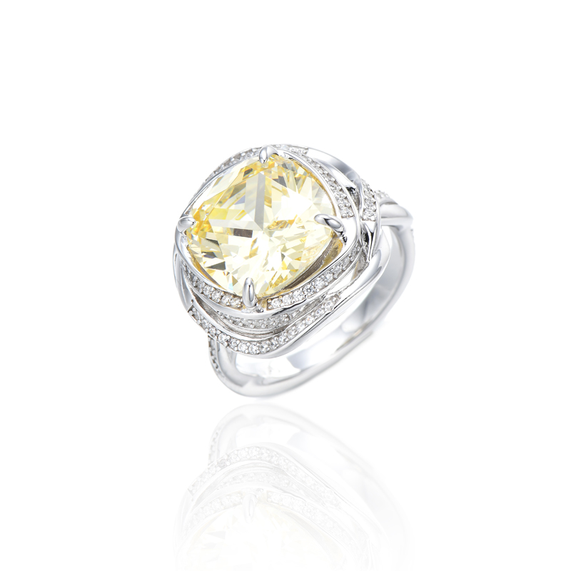 Cushion Canary And Round White Cubic Zircon Rhodium Silver Ring