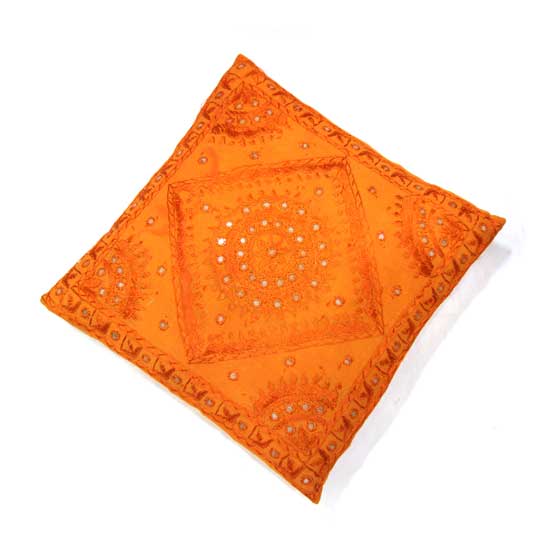 This square-shaped cushion cover features a bright orange color. The cushion is finely designed and made with delicate flower embroidery. The durable cushion cover boasts 100% cotton construction.