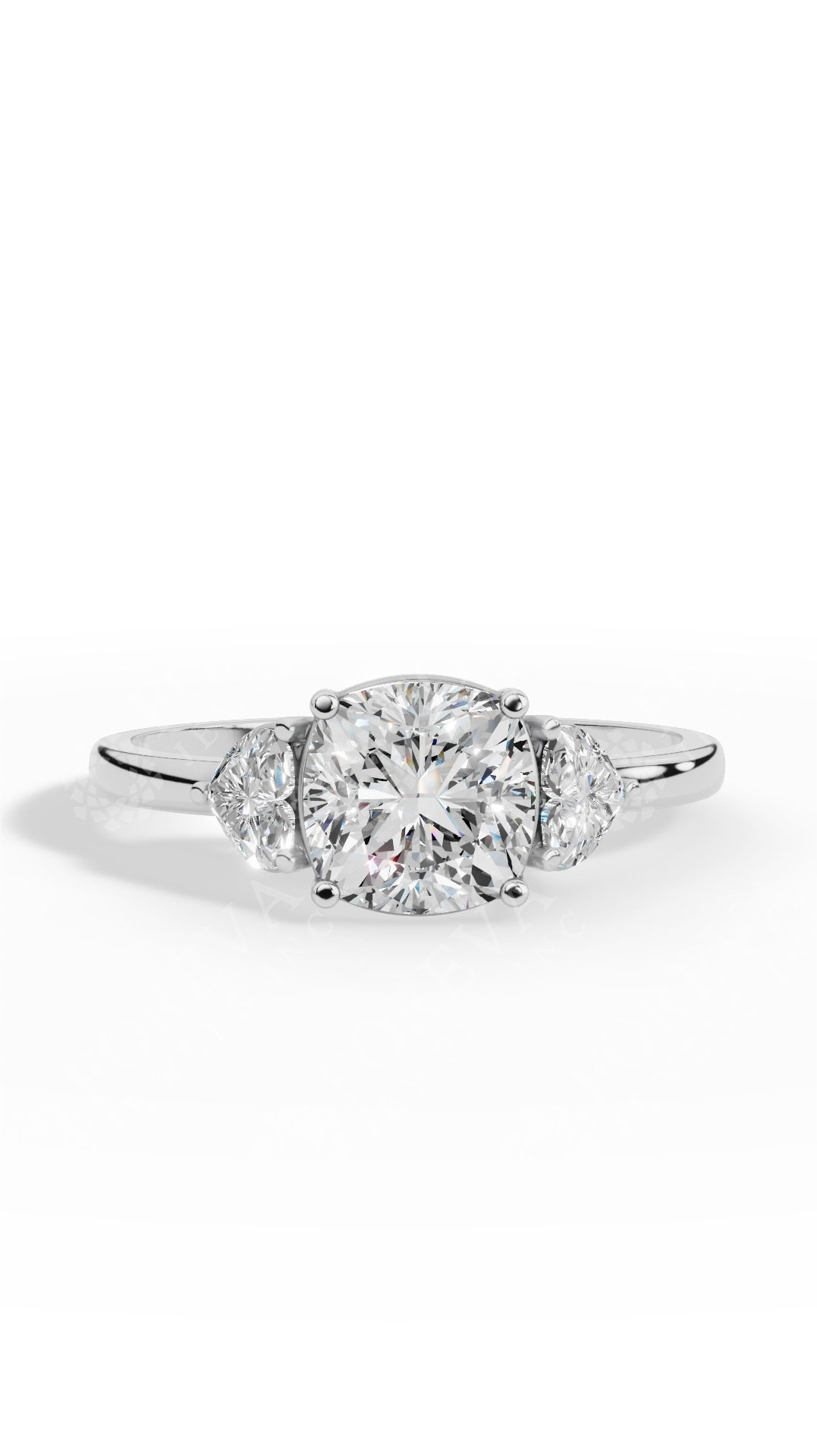 The cushion cut trio ring features a radiant heart-cut solitaire lab grown diamond flanked by two cushion cut stones, symbolizing past, present, and future love with exquisite brilliance.