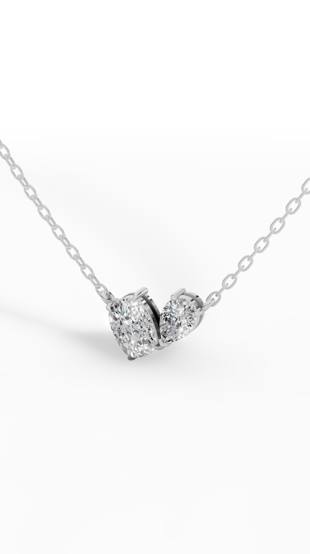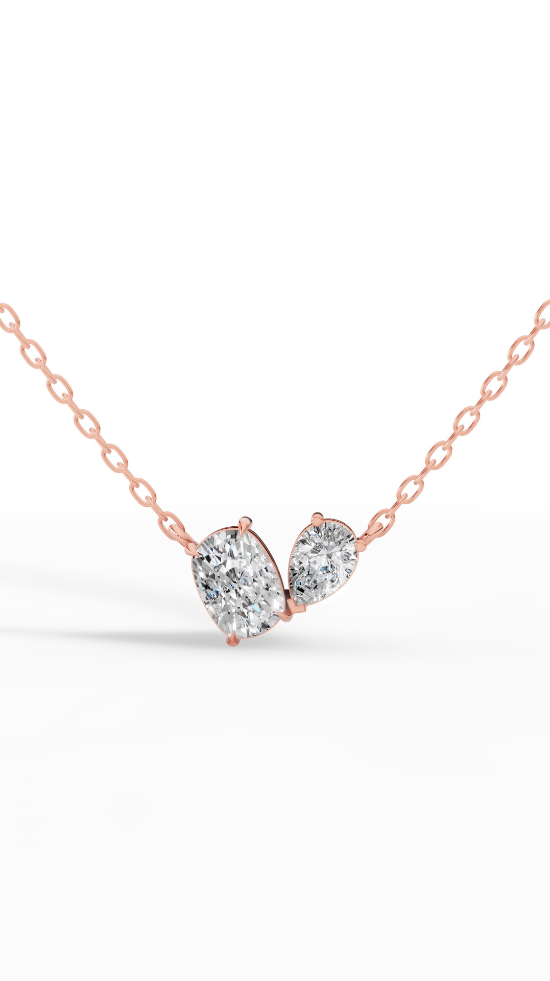 The Toi Et Moi necklace features a beautiful symbolic design pairing cushion and pear cut lab-grown diamonds, representing the timeless bond of two souls united in love and elegance.