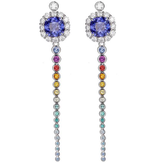 Cushion Tanzanite And Round Rainbow Cubic Zircon Rhodium Silver Earring