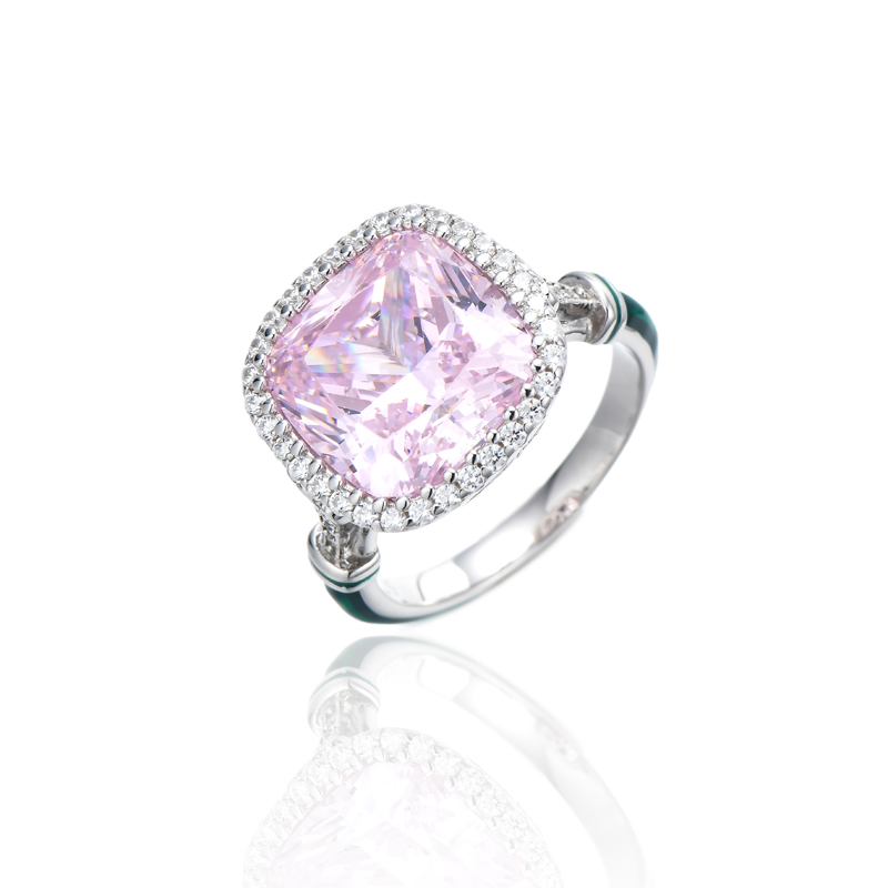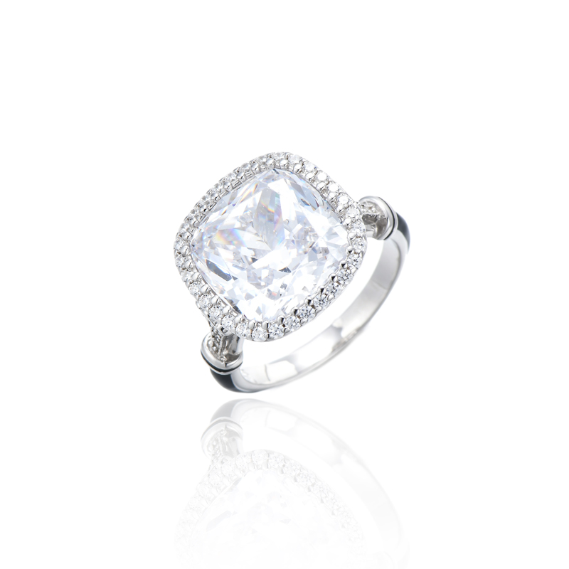 Cushion White Cubic Zircon And Black Enamel Rhodium Silver Ring