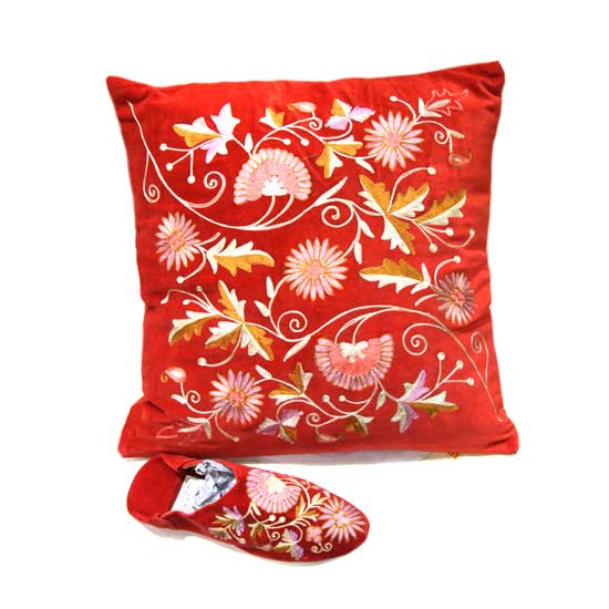 This exclusive cushion and slipper set boasts a bright red color. The cushion and slippers are finely made from cotton and velvet fabric with delicate floral embroidery. This cushion and slipper set will add a festive touch to your home decor.