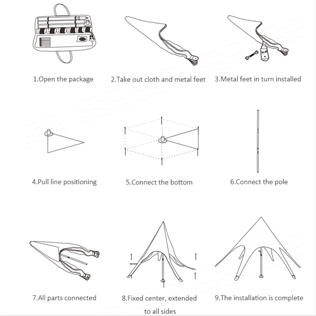 Feature: | 1. Durable, heavy duty anodized aluminium frame, sturdy in wind and anti-corrosion. 2. Strong Nylon connectors, well performed in abrasion. 3. Multifunctional, waterproof, flame retardant(CPAI-84) and ultraviolet resistant(50+). |