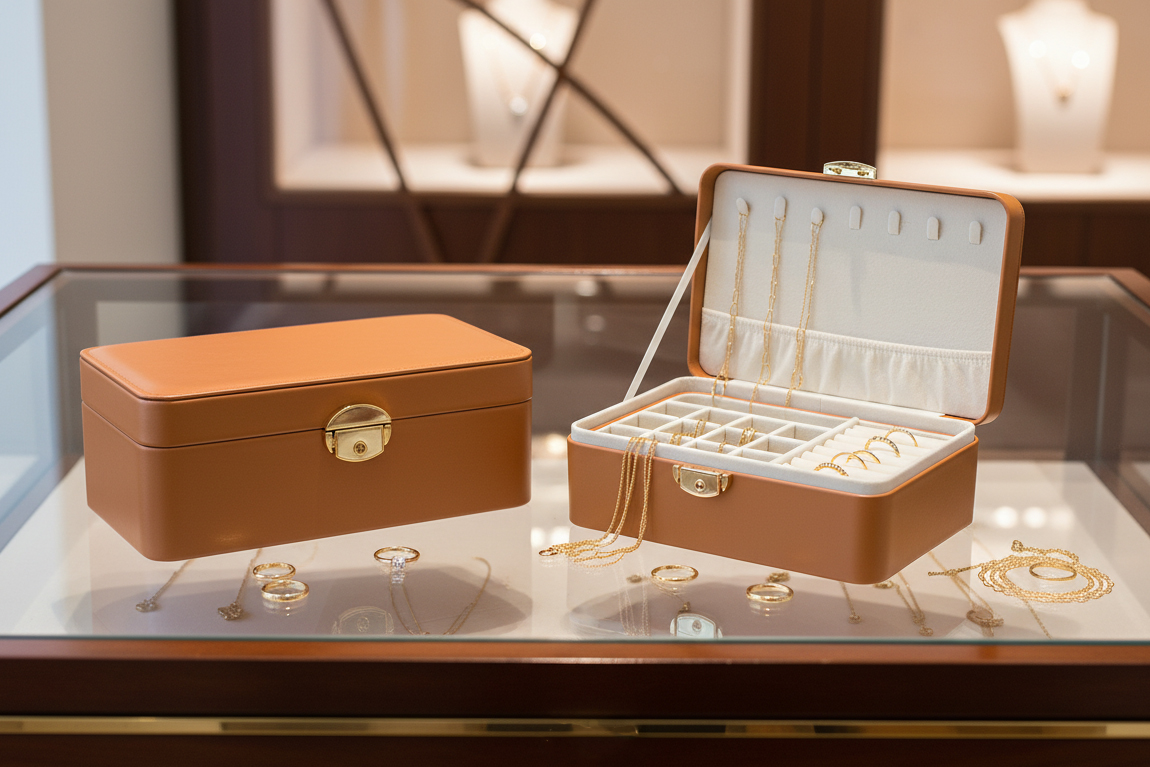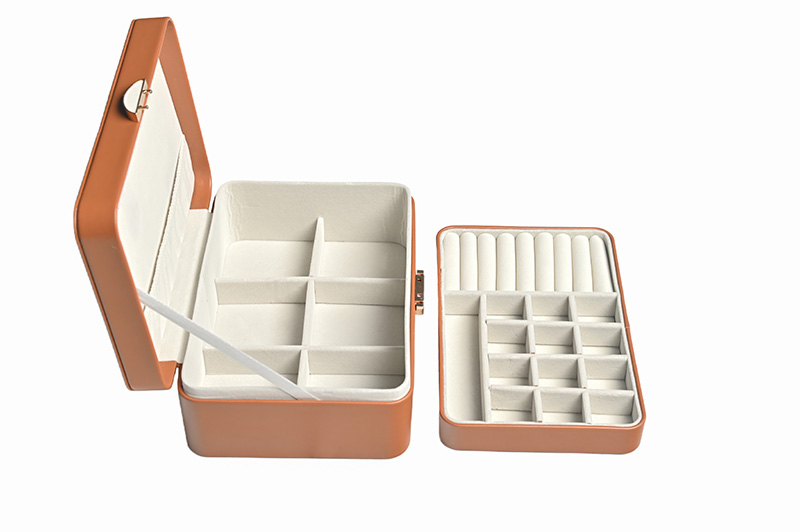 This exquisite custom brown PU leather jewelry storage box is crafted from premium textured PU leather for a smooth, refined touch that is easy to clean, offering both elegance and modern style. The interior features a combination of soft velvet and suede lining, providing a gentle, protective environment to prevent your jewelry from scratches and tarnish. Thoughtfully designed compartments include a dedicated ring storage section, multiple divided slots, and an elastic pocket—perfect for neatly organizing rings, earrings, necklaces, bracelets, and more. A sophisticated metal clasp ensures both security and a luxurious look.