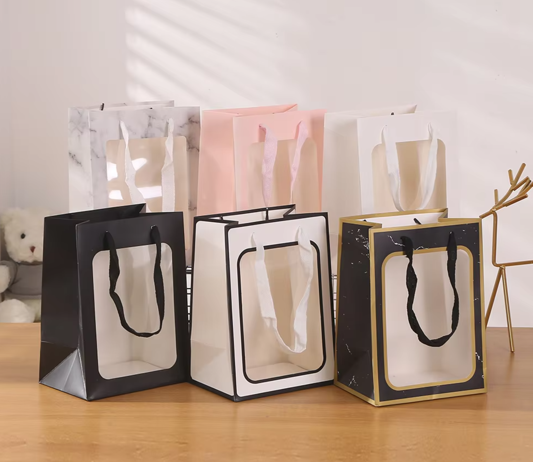 Customized Logo Rectangular Window Gift Bag Handmade Kraft Paper Ribbon for Clothing Craft Candle Food Packaging