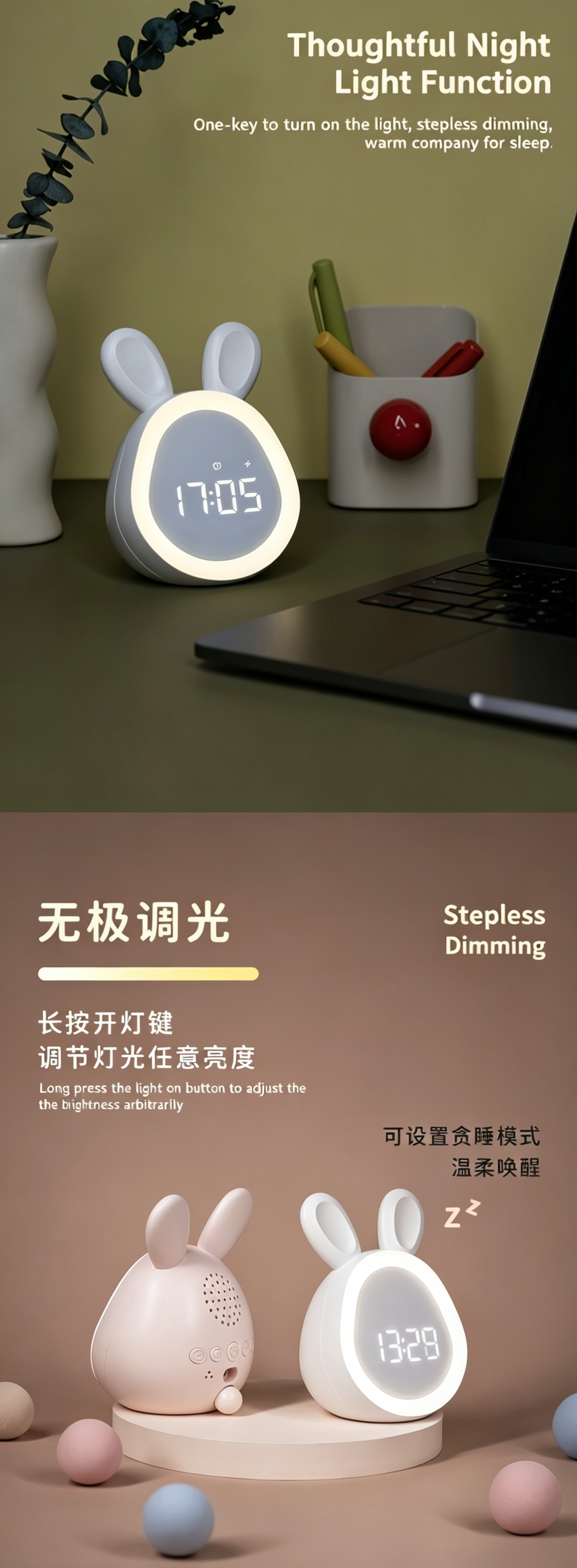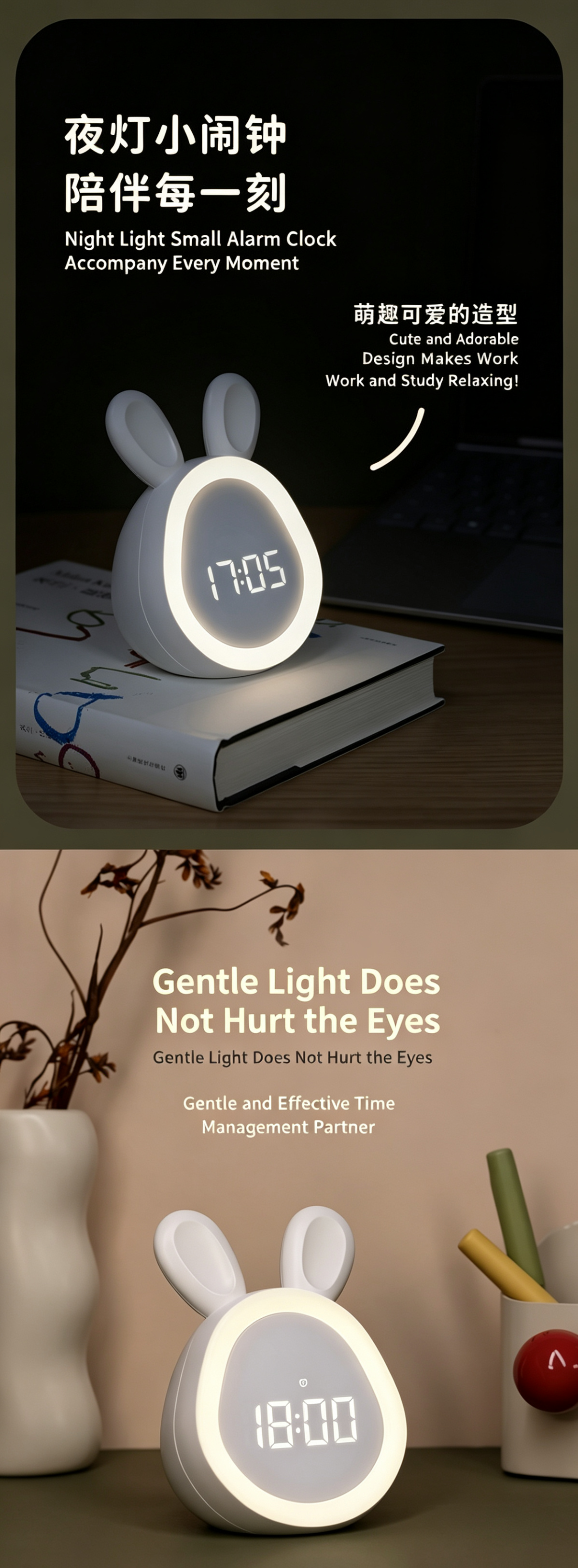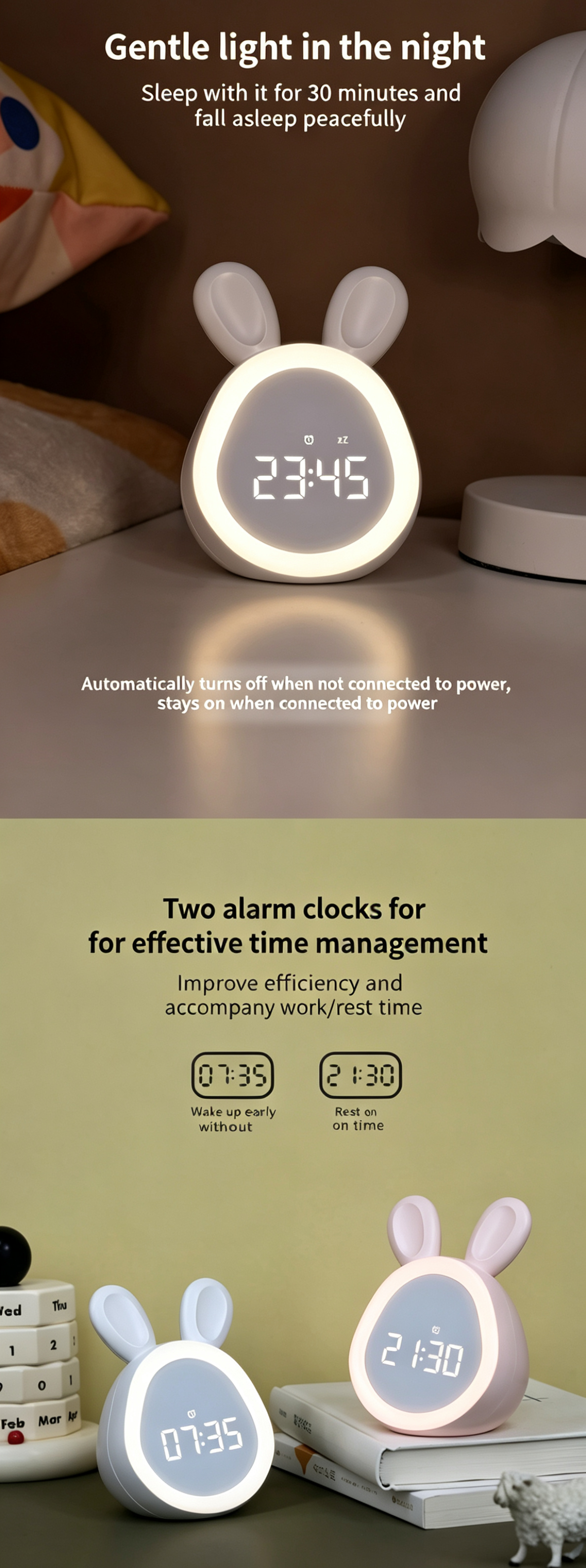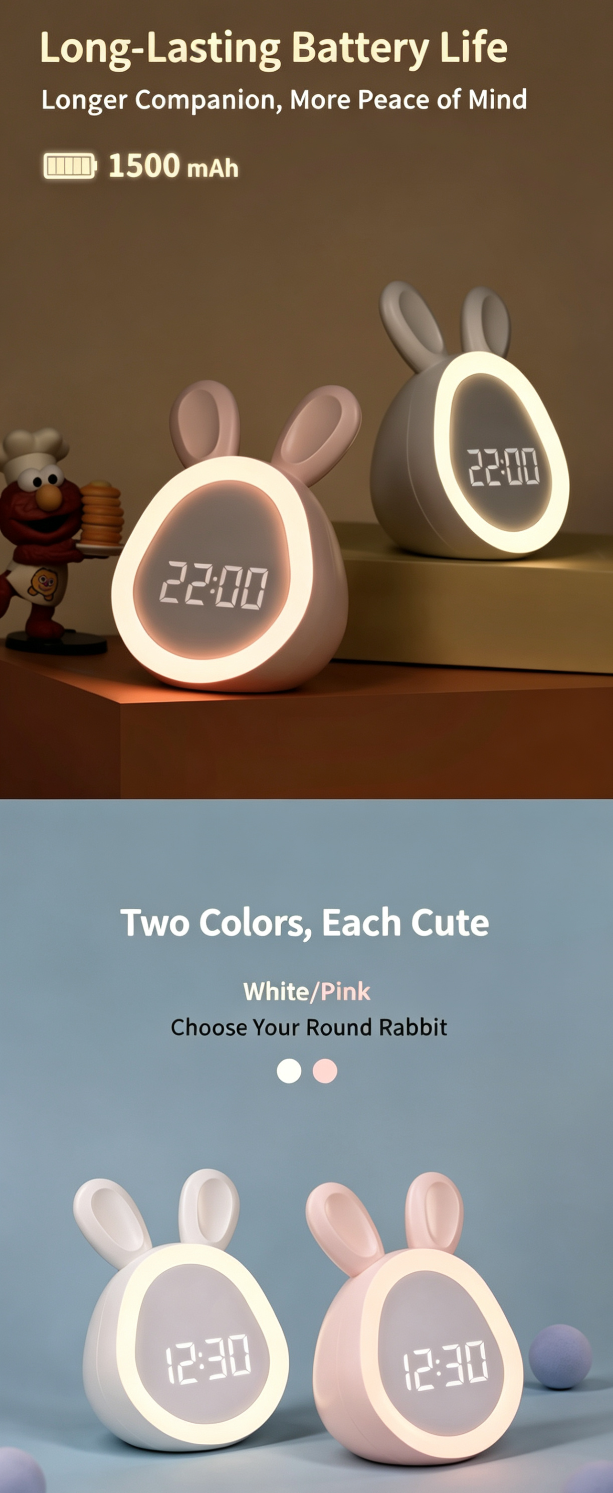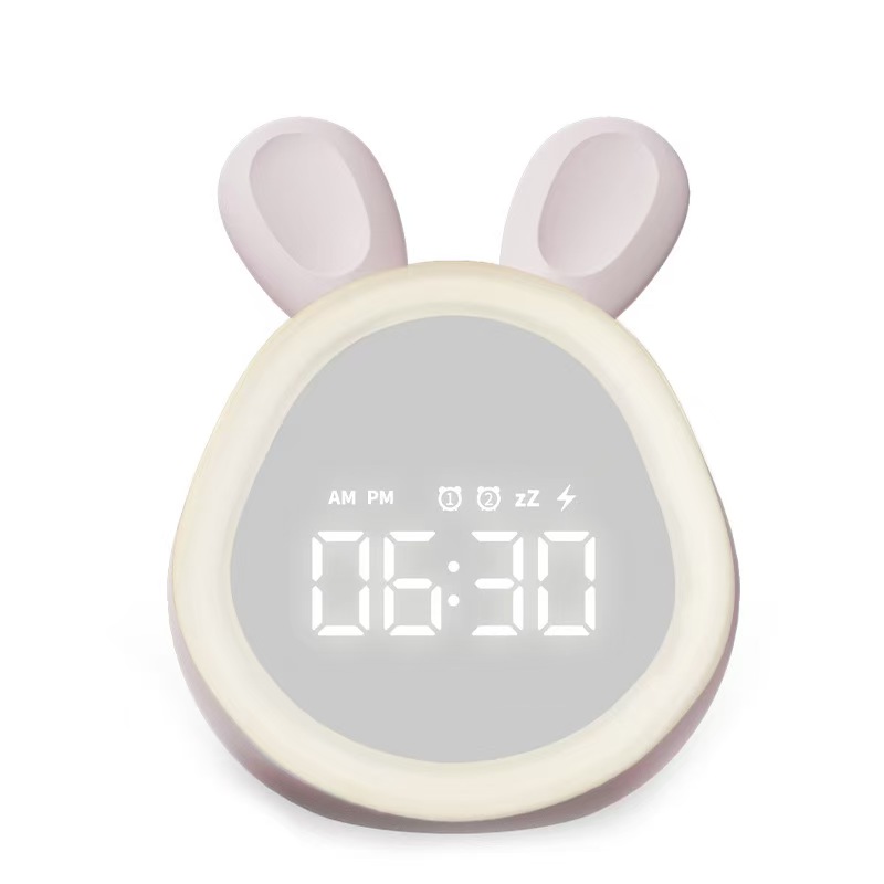 This cute bunny alarm clock combines a clock, night light and sound alarm in one lovely design. It features dual alarms, adjustable ringtones and a snooze function to help kids and students wake up gently. The soft dimmable night light supports a 30-minute auto-off timer, perfect for bedtime. You can control time, alarms and brightness via app, or use tap/knock to activate the screen. Powered by a rechargeable 1500mAh battery with Type-C charging, it is safe, durable and great for bedrooms, desks and gifts.