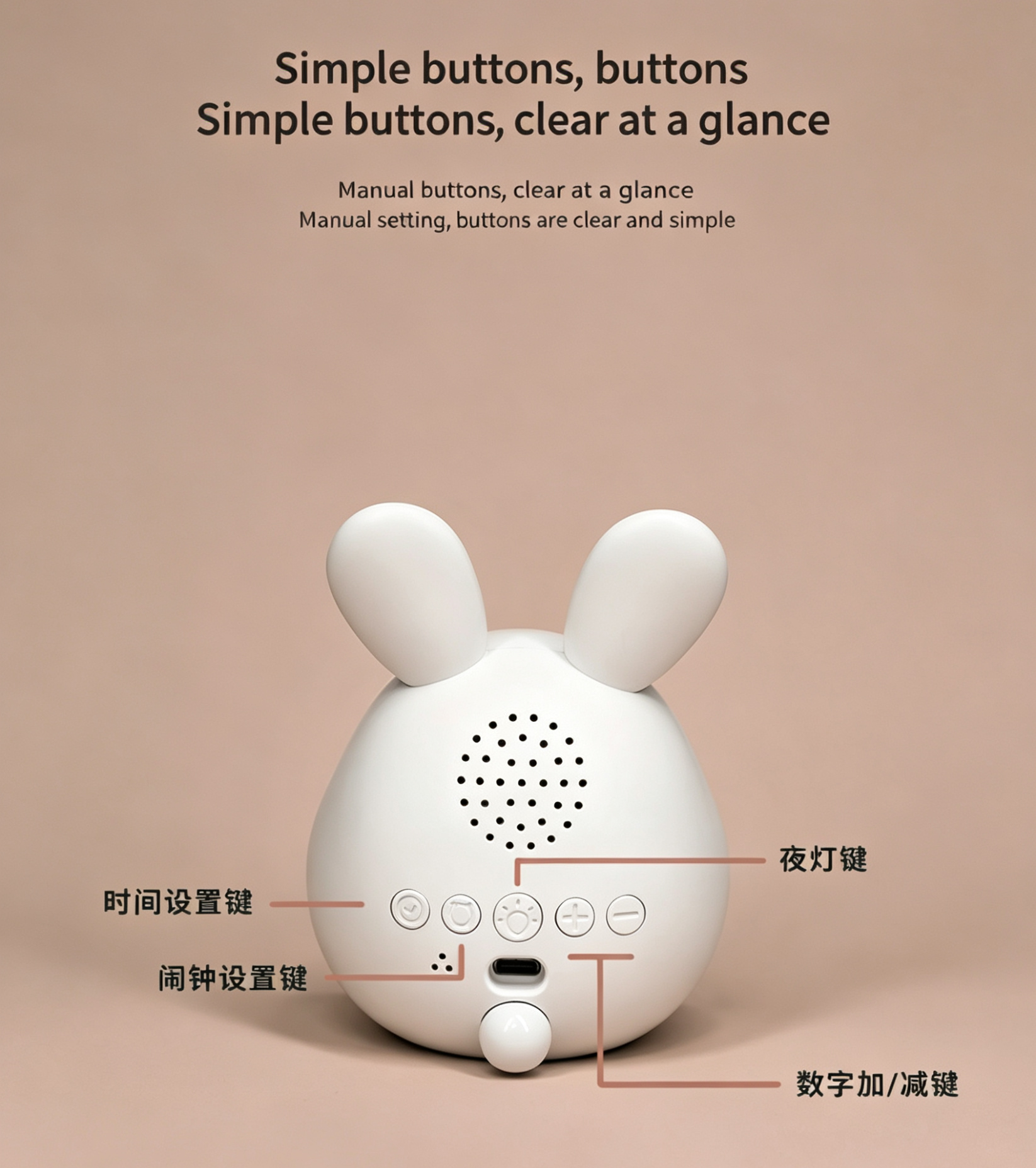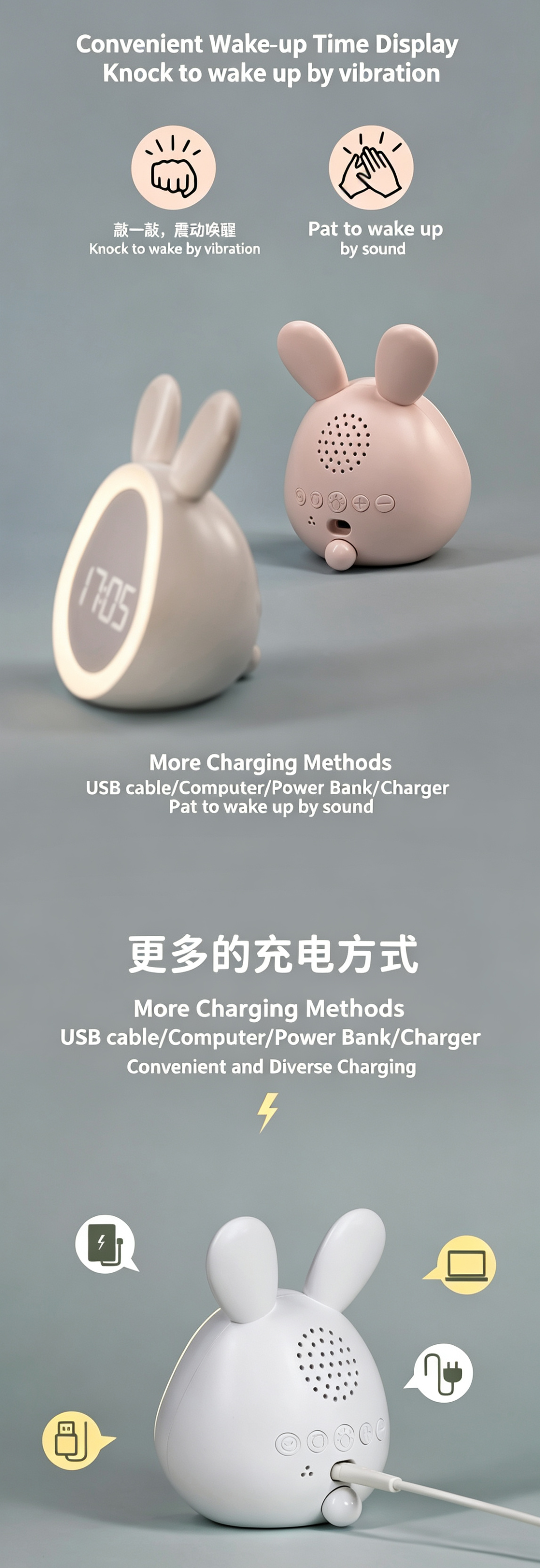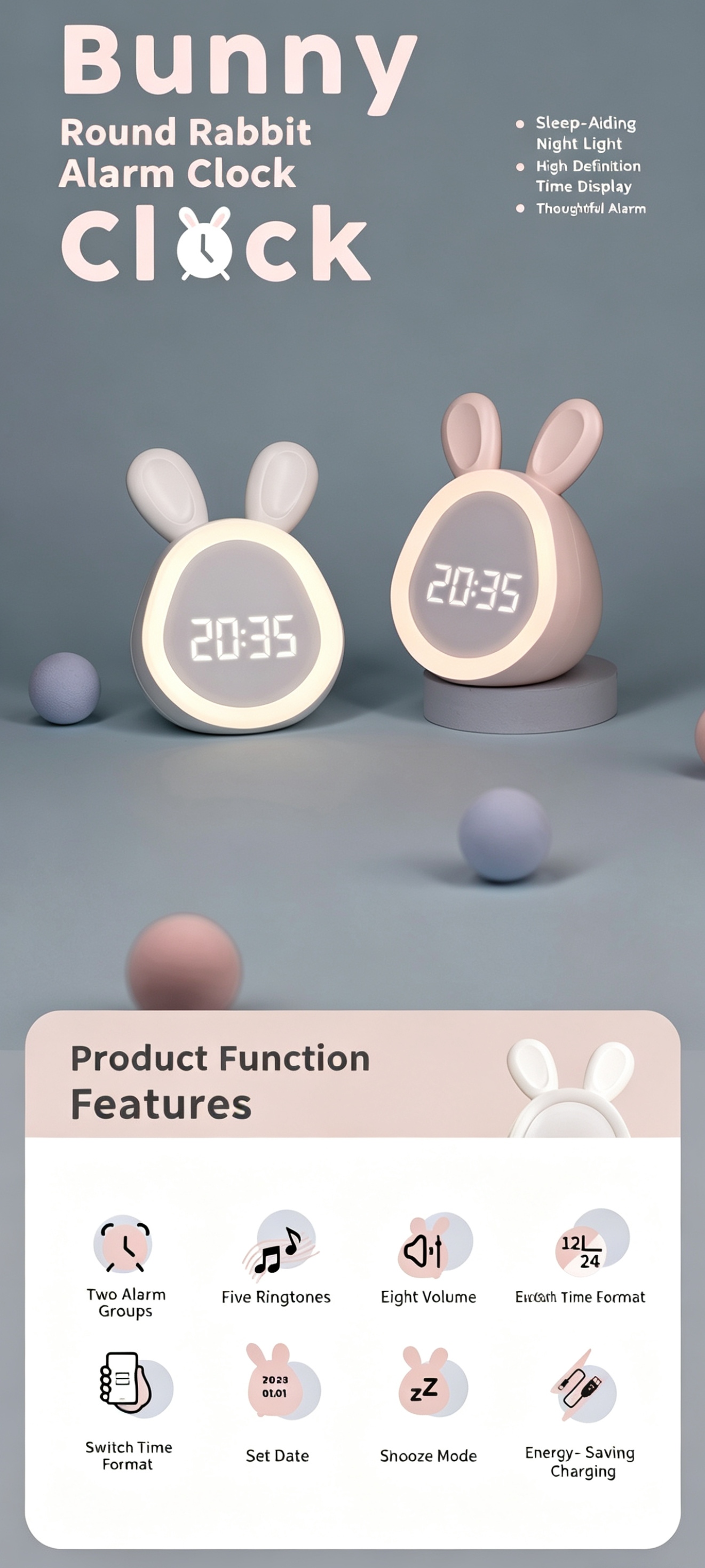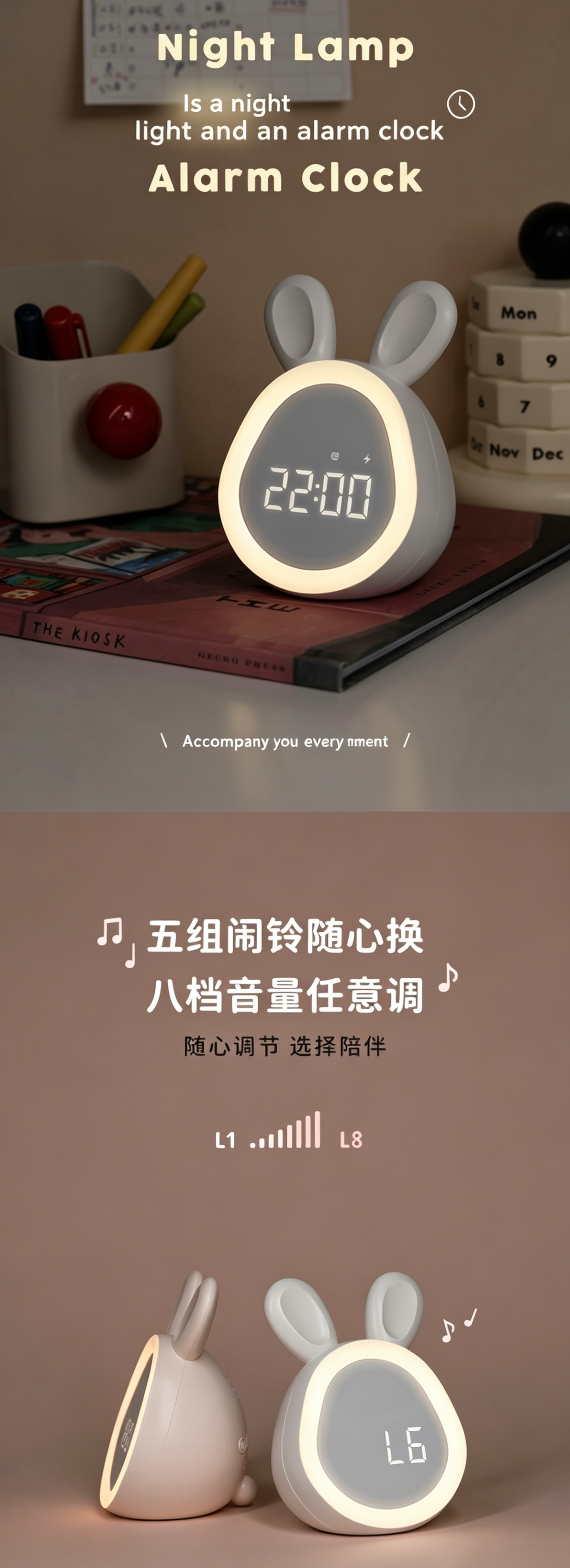 This cute bunny alarm clock combines a clock, night light and sound alarm in one lovely design. It features dual alarms, adjustable ringtones and a snooze function to help kids and students wake up gently. The soft dimmable night light supports a 30-minute auto-off timer, perfect for bedtime. You can control time, alarms and brightness via app, or use tap/knock to activate the screen. Powered by a rechargeable 1500mAh battery with Type-C charging, it is safe, durable and great for bedrooms, desks and gifts.
