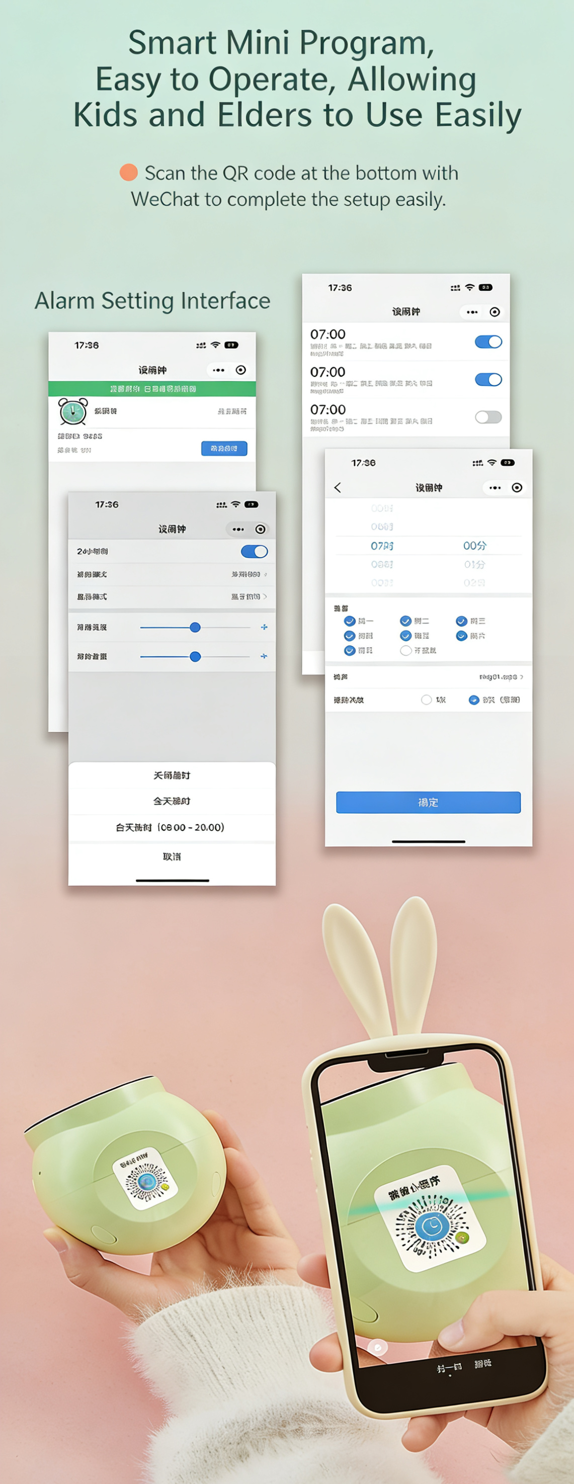 Connect via WeChat Mini Program—no complex apps needed. Easy setup for time, alarms, brightness, and volume for kids, parents, or the elderly.