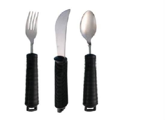 Outlined is a cutlery set comprising a spoon, fork and rocker knife in bendable style for gratifying flexibility. They both showcase a silvery rigid construction and are paired with black rubberized handles. The handles are characterized by corrugated details which promise an extra firm grip.