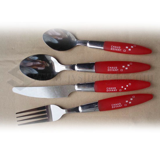 This is a stainless steel cutlery set carefully made for extra sturdiness. It features a knife, a fork, a soup spoon and a dessert spoon. The plastic handles allow for an easy hand grip and add a style to your dining table.