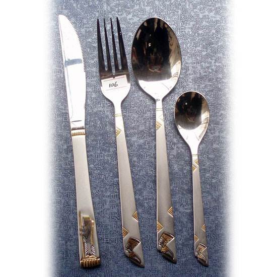 This is a set of gold plated cutlery coming with an Egyptian pattern. It is carefully made for added sturdiness. It is traditional and versatile.