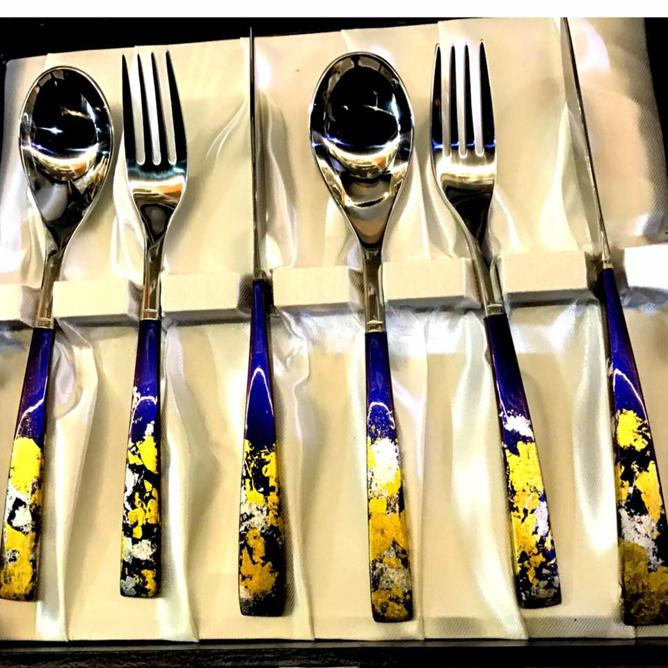 Lacquer coated glass and contemporary lines make this 6-piece cutlery set a sleek look for versatile table presentations. The splashed gold detailing on its flat handle design gives a dash of exquisiteness and class to draw attention. It further makes an ideal present for housewarming parties and more.