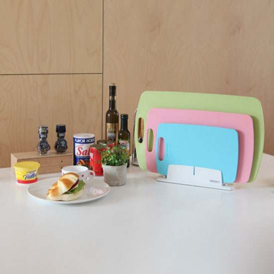 Prepare tasty dishes with this 3-piece cutting board set. The plastic boards are sturdily constructed for extended durability. The set includes a simple stand to keep the cutting boards neat and tidy.