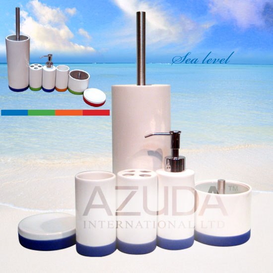 A set of bathroom accessories which is made of ceramic or silicon. The set includes tumbler, toothbrush holder, soap dish, toilet brush holder and lotion dispenser. The set is suitable for home use.