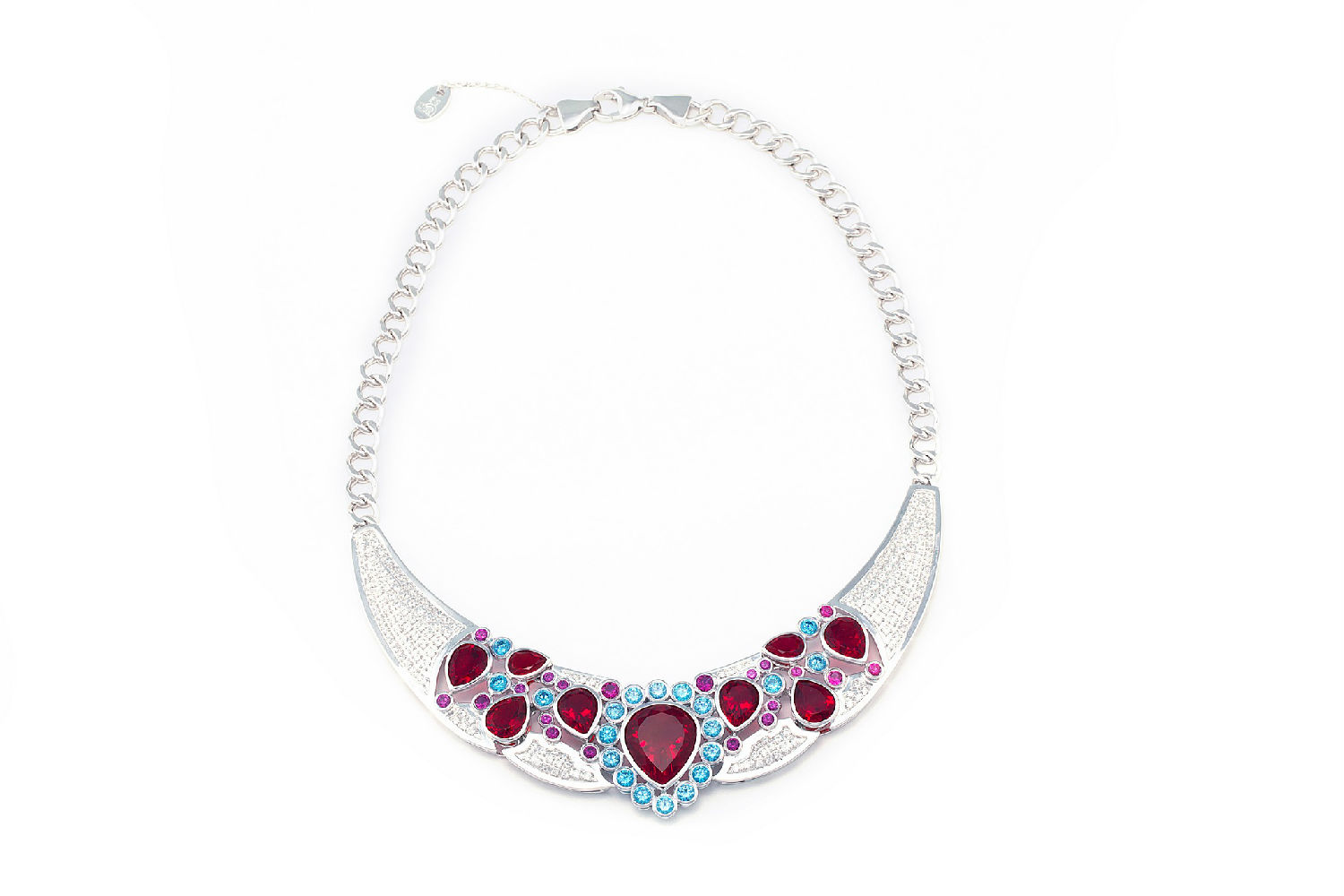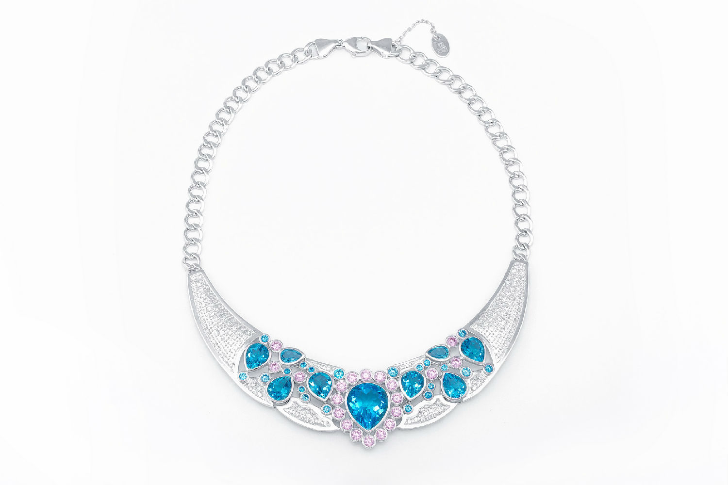 This beautifully crafted centre piece necklace is silver and rhodium plated and embellished with large aquamarine stones, amethyst and light aquamarine. Accented with inset diamonds and a large rhodium plate gourmette link chain ensures a comfortable fit. This setting also comes in ruby, emerald and light ruby.