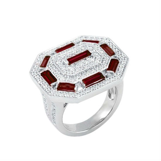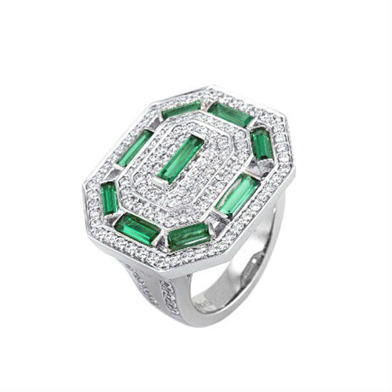 This diamond laid ring is a true show stopper inspired by art deco. Fine silver with a rhodium finish, diamonds borounder the band of the ring as well as baguette cut emeralds that lie in formation of the octagon layers sprinkled in diamonds. This setting also comes in sapphire and ruby.