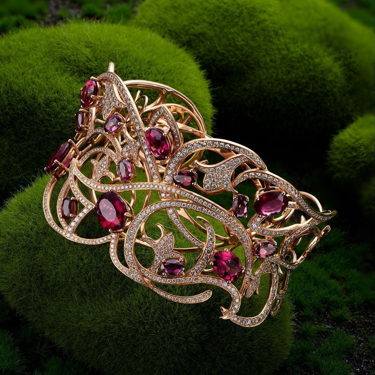 The 'DANCING PHOENIX' - 18K Gold Ruby & Diamond Bangle was designed by the awarded jewelry designer, Ben Yep. This exquisite bangle showcases the majestic flying phoenix, adorned with natural and hand-picked rubies and diamonds. It has been honored with the prestigious Gold Award at the Kapok Jewellery Design Award China.