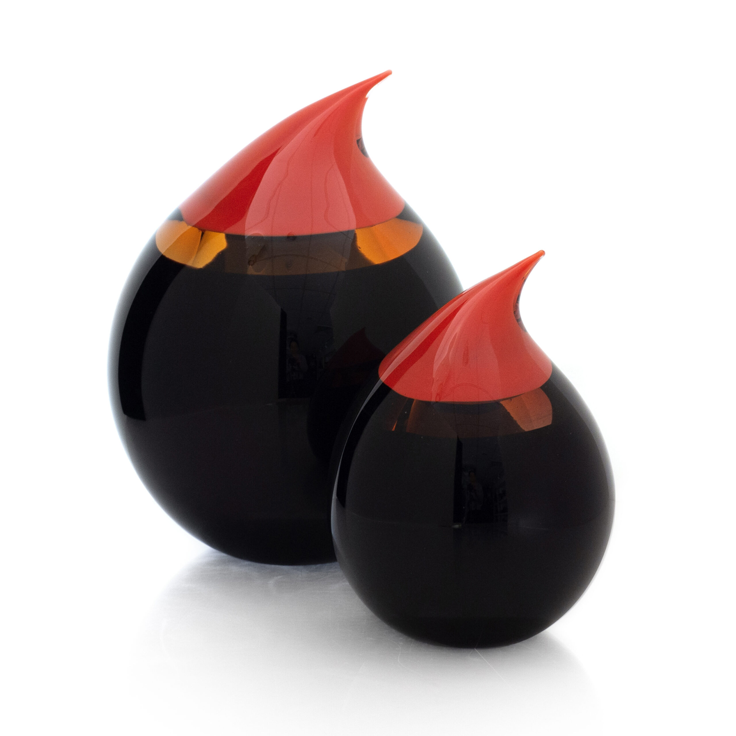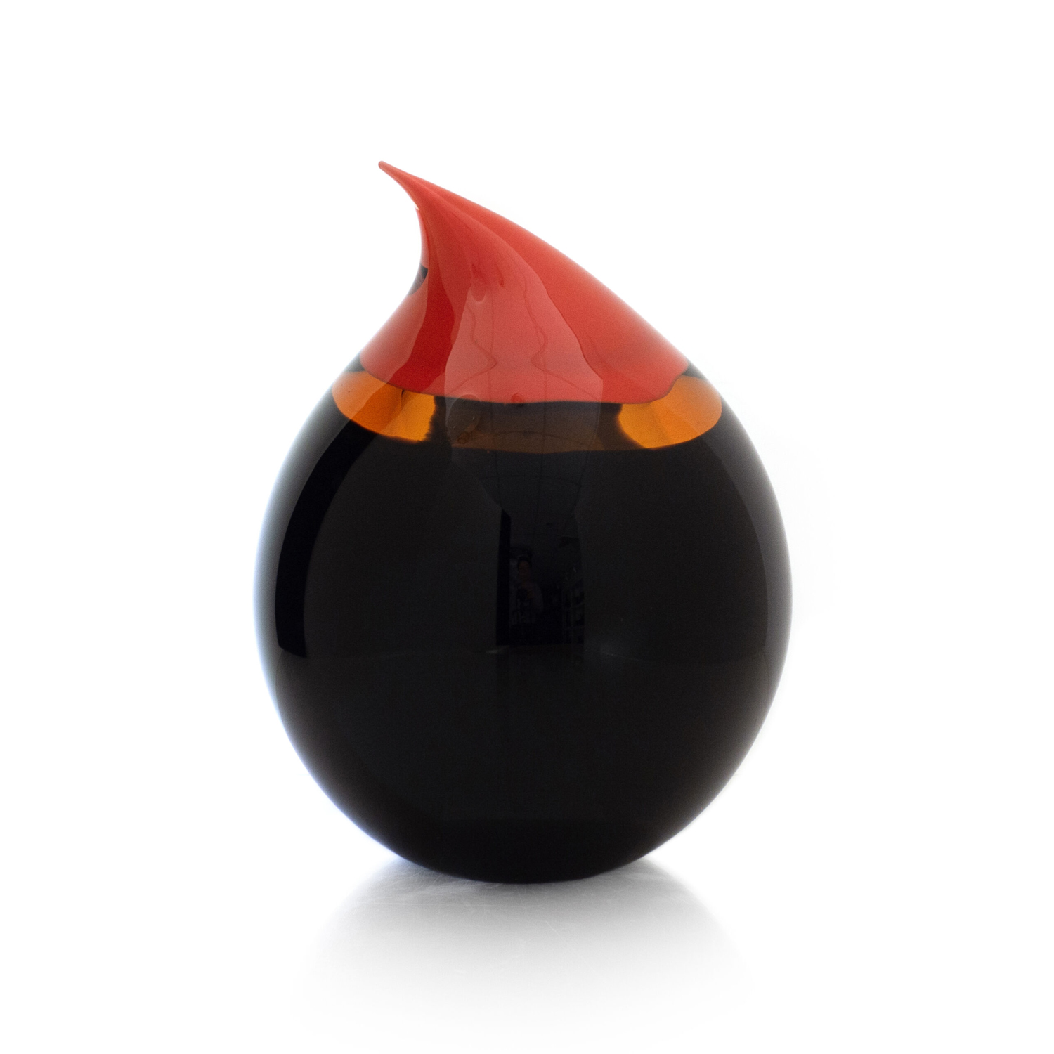 Powerful hues of vivid red and inky black evoke fire and coal in this mysterious and dynamic sculpture.