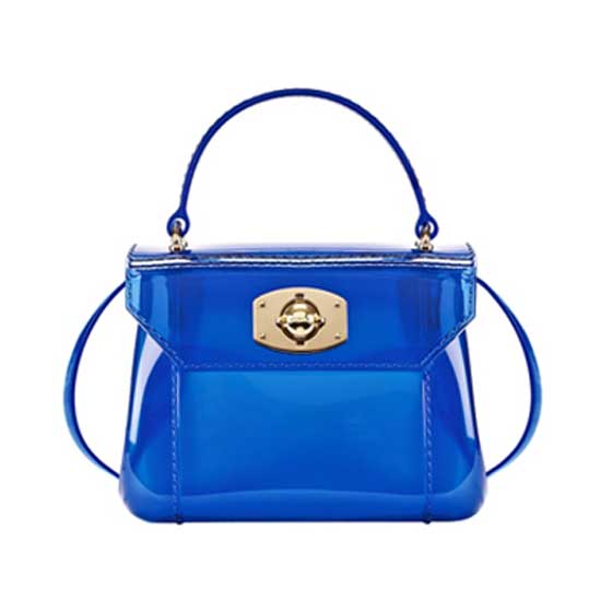 This is a ladies' handbag that features a streamlined and unique body with a durable handle. It is designed in allover brilliant blue with a highly glossy finish. The golden accent adds a touch of elegance to this bag.