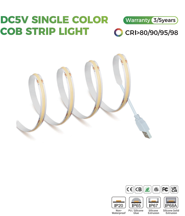该LED灯带采用COB LED作为光源,具有功耗低、亮度高、使用寿命长等特点。可以切割成不同的长度,提供180度光束角,无可见的光点。LED灯带内部有胶带,安装方面,性能安全可靠。