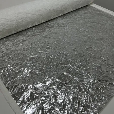 High-quality decorative fabric with foil-coated shrug. The material is pleasant to the touch, medium density, has a marvelous visual effect, silver coating with white scuffs on the front side. It is not elastic, windproof, holds its shape. Please note that the material is made on the technical underside, not perfectly white, with gray, milky marks and stains;