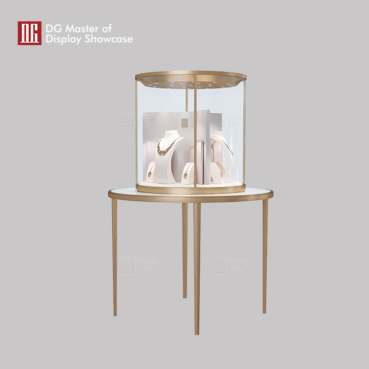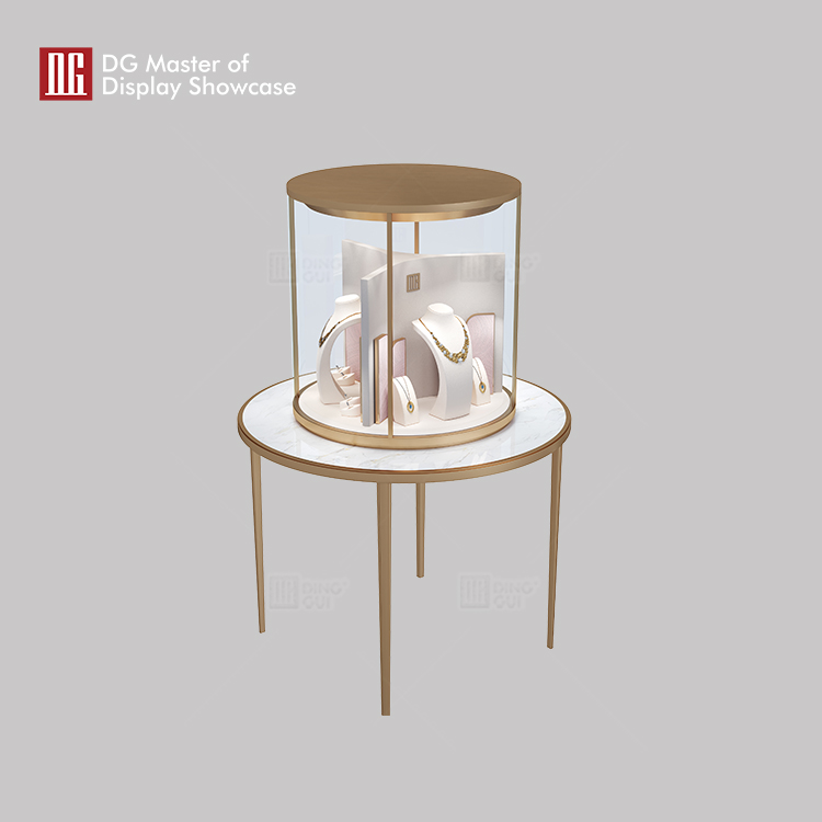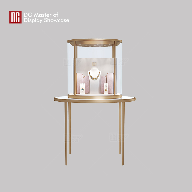 DG jewelry and watch island display showcase features classic design and high-end craftsmanship, seamlessly combining anti-fingerprint stainless steel and tempered glass for clear vision. Two locking mechanisms are available to meet various security needs. Hot-bent glass technology, is fashionable and unique, with wide viewing angles. Suitable for jewelry exhibitions, museums, etc., providing ideal display solutions for exhibits and adding higher display value.