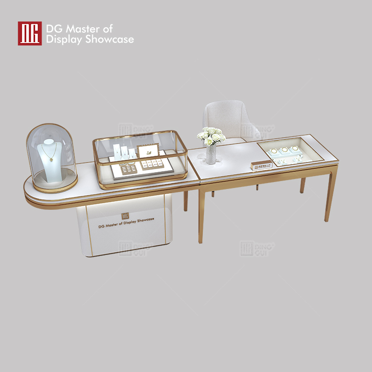 You are now enjoying the elegant and classic jewelry experience table of DG Display Showcase. The whole consists of high quality PVC leather and brushed champagne gold stainless steel. Anti-fouling and impermeable, dustproof and good scrubbing. Rounded corner transition, safe and beautiful. Smooth lines combined with a moderate height of the experience table. Ergonomic, comfortable experience. High flexibility to meet the needs of various spaces. Minimalist design and rich details. Meet the double standard of international and modern style. Bring a whole new experience to modern luxury. Areas of use include showrooms, chain stores, shopping centers, etc. If you also like this experience table, welcome to contact DG Display Showcase.