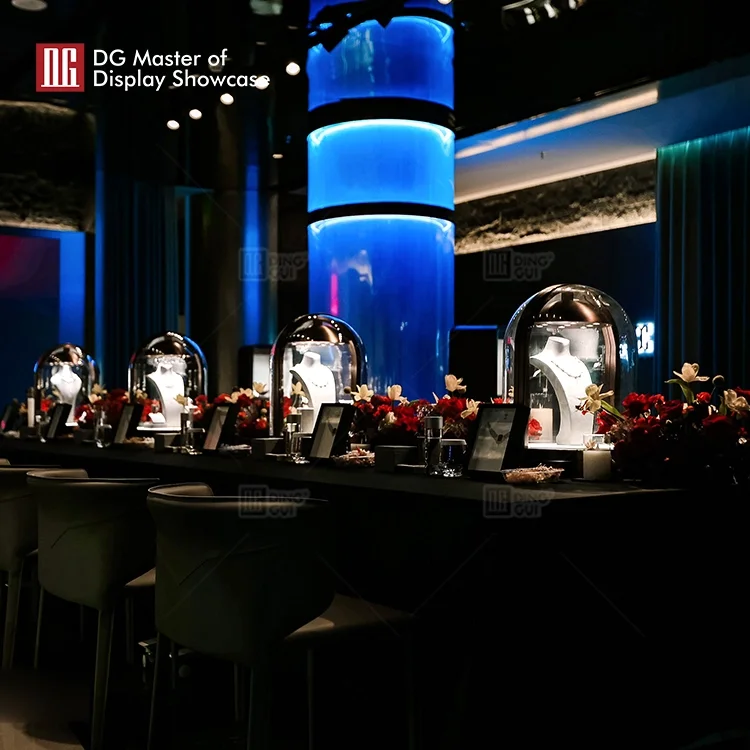 This bespoke luxury display showcase is the rechargeable luxury jewellery display case from DG Display Showcase 2023.It can be applied to luxury jewelry stores, watch stores, luxury stores and other high-end places.The novel design concept is unprecedented and can quickly attract customers' attention.The excellent hot bending glass technology enhances the design sense and aesthetic degree of this exhibition case.The intelligent opening mode of electronic lock provides you with convenient opening mode and safe mode.Intelligent adjustable lighting system can meet the diverse needs of customers.At the same time, we can provide one-stop service for jewelry display cases, including design, manufacture and installation.If you also like this jewelry showcase, welcome to contact DG Master of display showcase.