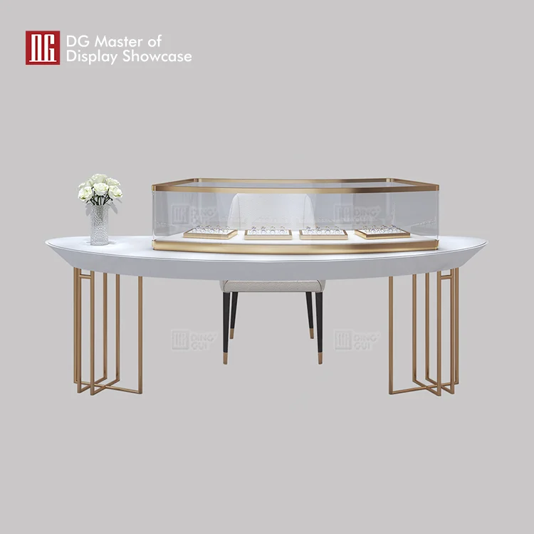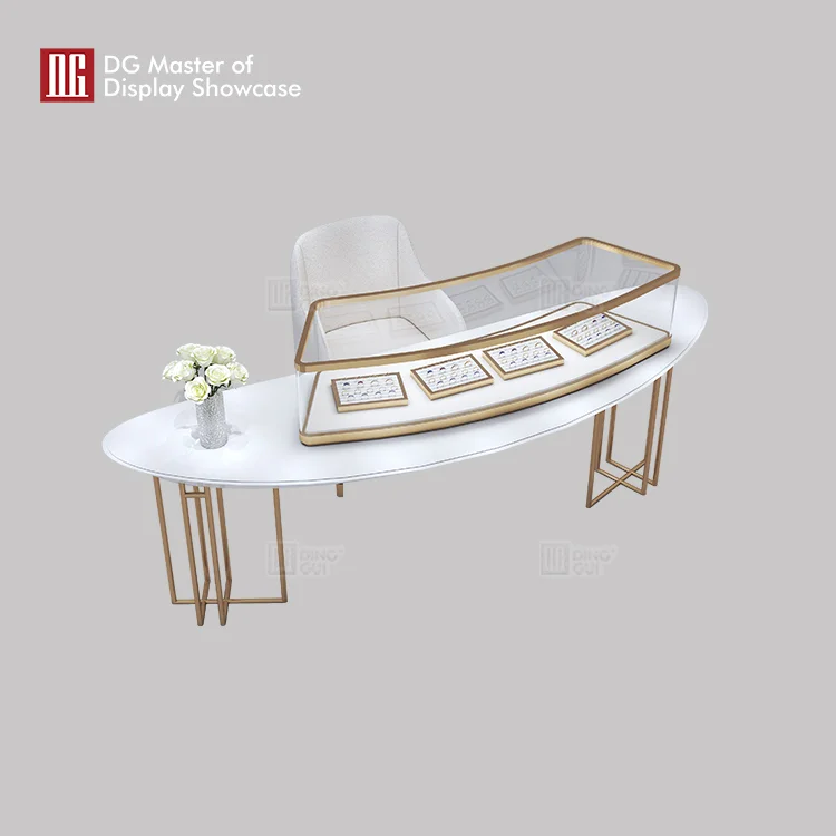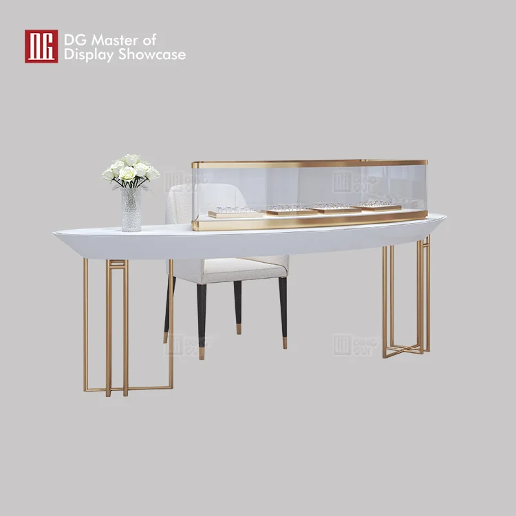 You are now enjoying the elegant and classic jewelry experience table of DG display showcase. The whole consists of high quality Baking Paint and brushed champagne gold stainless steel. Anti-fouling and impermeable, dustproof and good scrubbing. Rounded corner transition, safe and beautiful. Smooth lines combined with a moderate height of the experience table. Ergonomic, comfortable experience. High flexibility to meet the needs of various spaces. Minimalist design and rich details. Meet the double standard of international and modern style. Bring a whole new experience to modern luxury. Areas of use include showrooms, chain stores, shopping centers, etc. If you also like this experience table, welcome to contact DG display showcase.