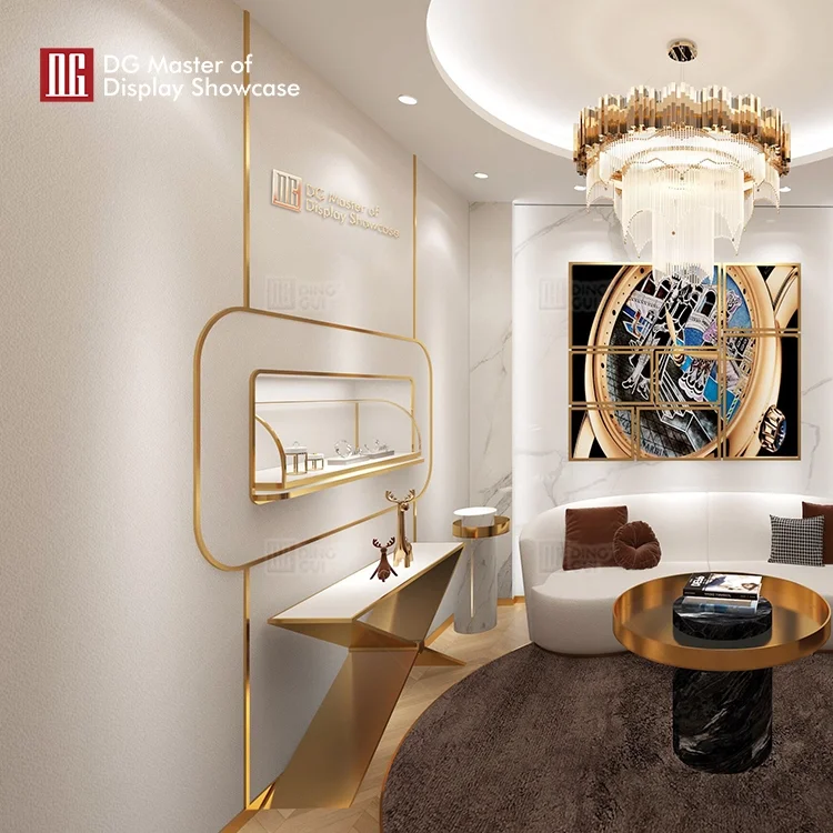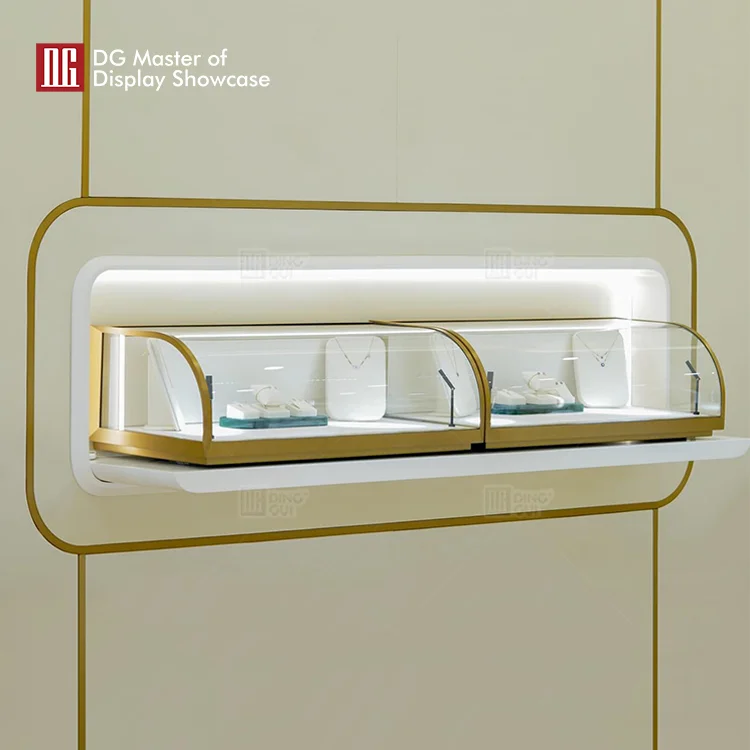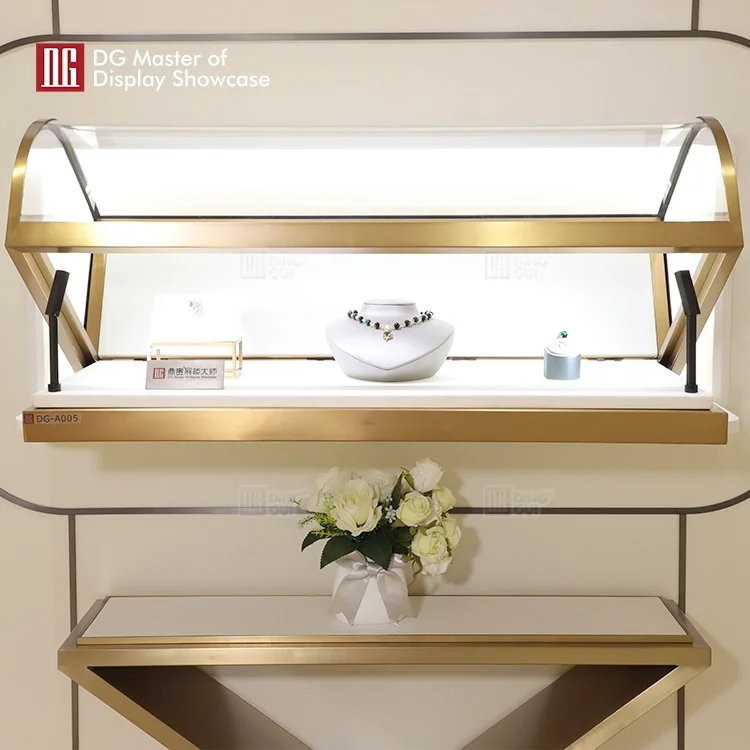 This is the latest luxury combination wall display cabinet launched by DG Display Showcase. Not only does it attract the eye, it also provides efficient exhibit protection. Safety is its primary concern. This display cabinet combination adopts different intelligent opening methods, which not only ensures the safety of exhibits, but also facilitates access to exhibits. It adopts a luxurious intelligent lifting display cabinet with an advanced opening method. The main body is designed in classic brass color, which can quickly attract attention. Equipped with an adjustable intelligent lighting system, it can evenly fill in light for multi-angle display. Internal leather embellishments enhance product display and attract customers' attention. The overall appearance is treated with brushed electroplating and fingerprint-free stainless steel, which is beautiful and unique and helps to better achieve sales targets.