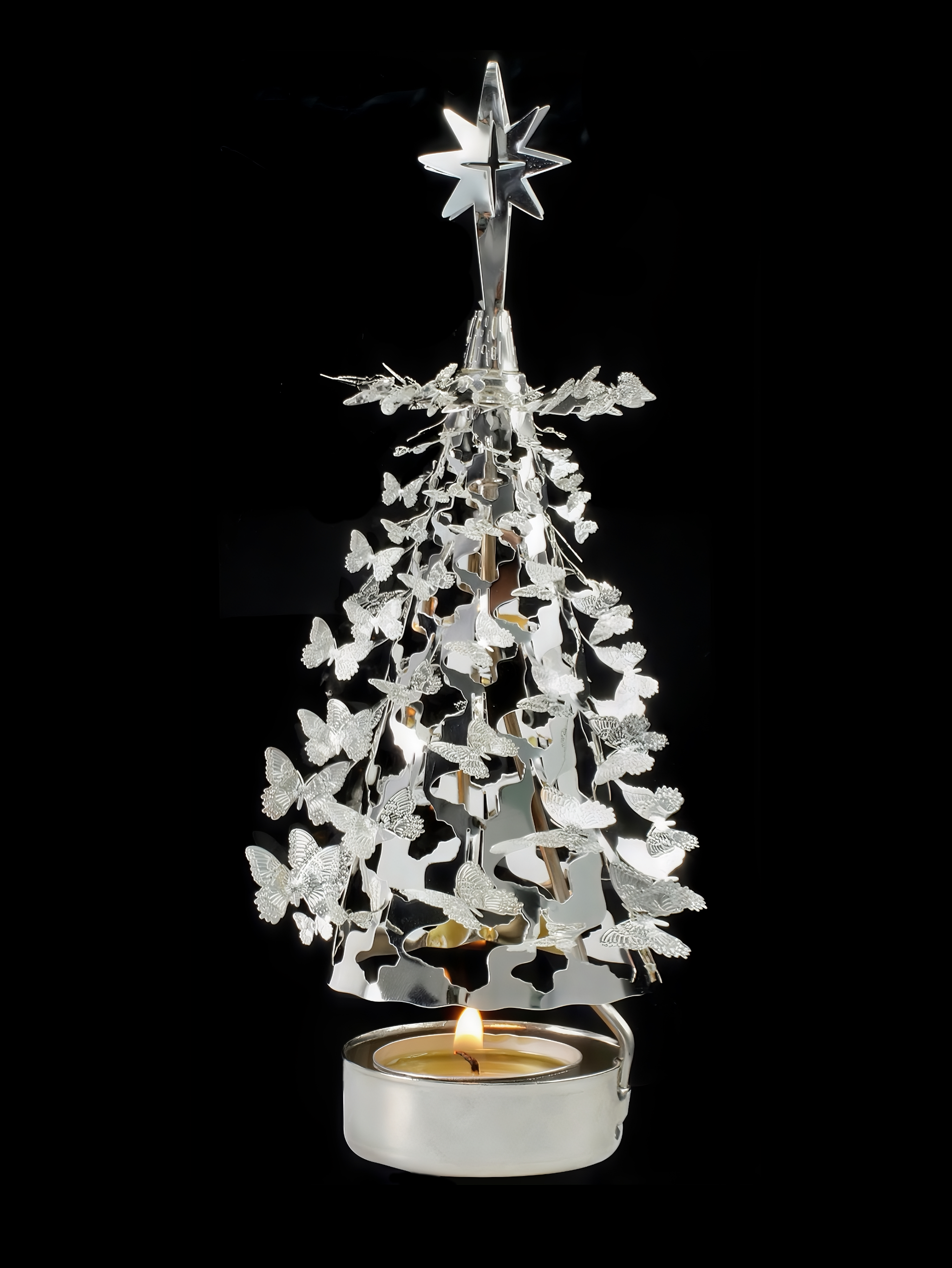 This is a rotary candle holder boasting a dainty and charming design. It is crafted with a Christmas tree look with sophisticated and exquisite details. The quality steel material promises a long service life.