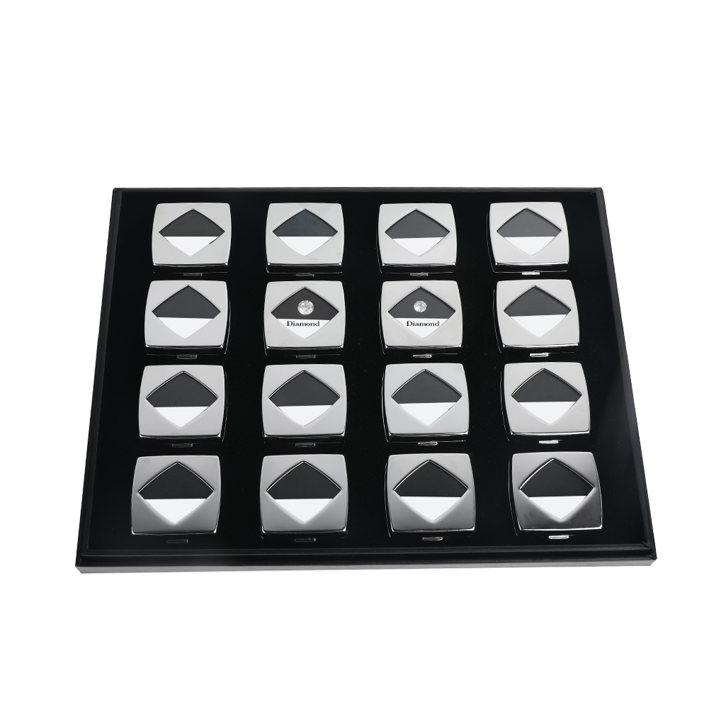 Metal display box set with reversible white and black cushion.