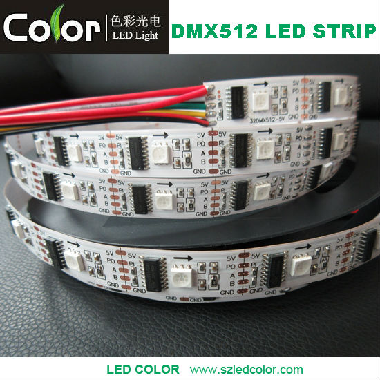 DMX512 IC is with the MAX485 inside the 512IC,and the DMX512 LED strip is make of DMX512 IC and hight brightness 5050SMD,with 3 data cable ,2 power wire(+V, PI address writing wire, A(DA+),B(DA-),GND).This kind of dmx led strip can be cut,can be series and parrallel connection,can be control without decoder. Also we have developed DC5V 32 IC 32 LEDs individual controlled DMX512 LED strip.And DC12V,10 DMX512IC 30 LEDs,one contrl three LED strip,also DC24V 10 DMX512IC 60 LEDs,one contrl six LED strip.