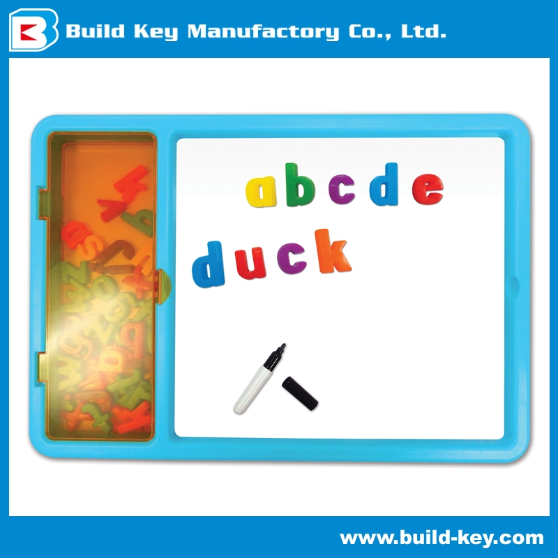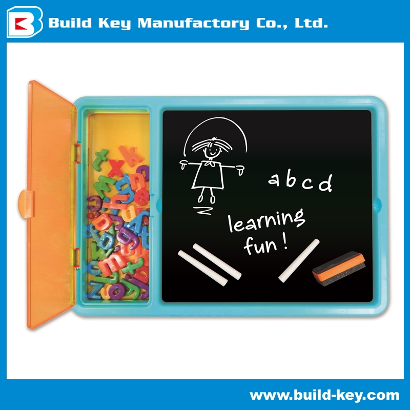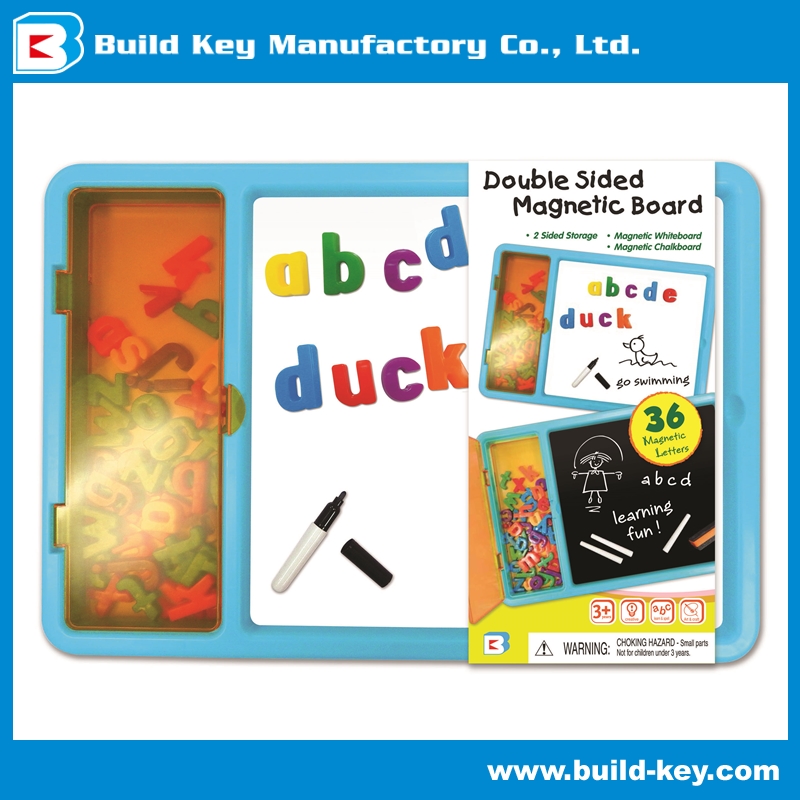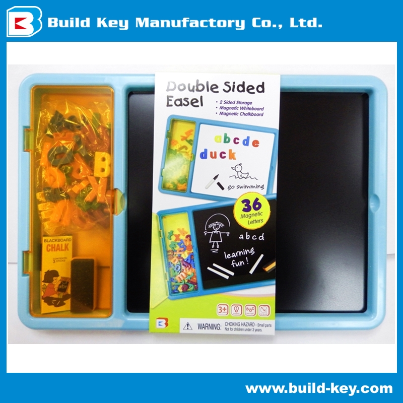 1 Doubled Sided Drawing Board (black / white) with side storage, 36 pcs x 1.25" Magnetic Letters, 3 Chalks, 1 Double Side Eraser