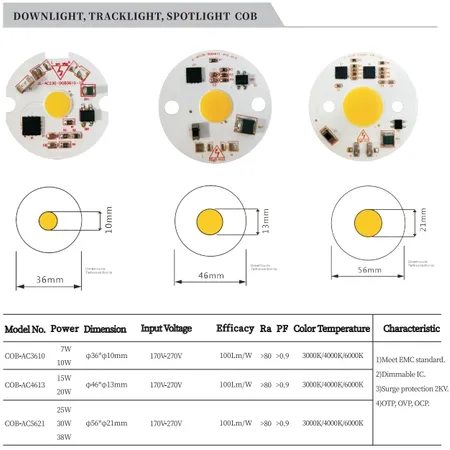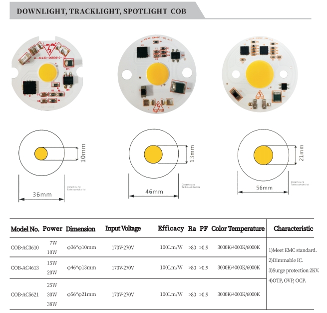 | COB-AC3610 | 7W | φ36*φ10mm | 170V-270V | 100Lm/W | >80 | >0.9 | 3000K/4000K/6000K | 1)Meet EMC standard. 2)Dimmable IC. 3)Surge protection 2KV. 4)OTP, OVP, OCP. |