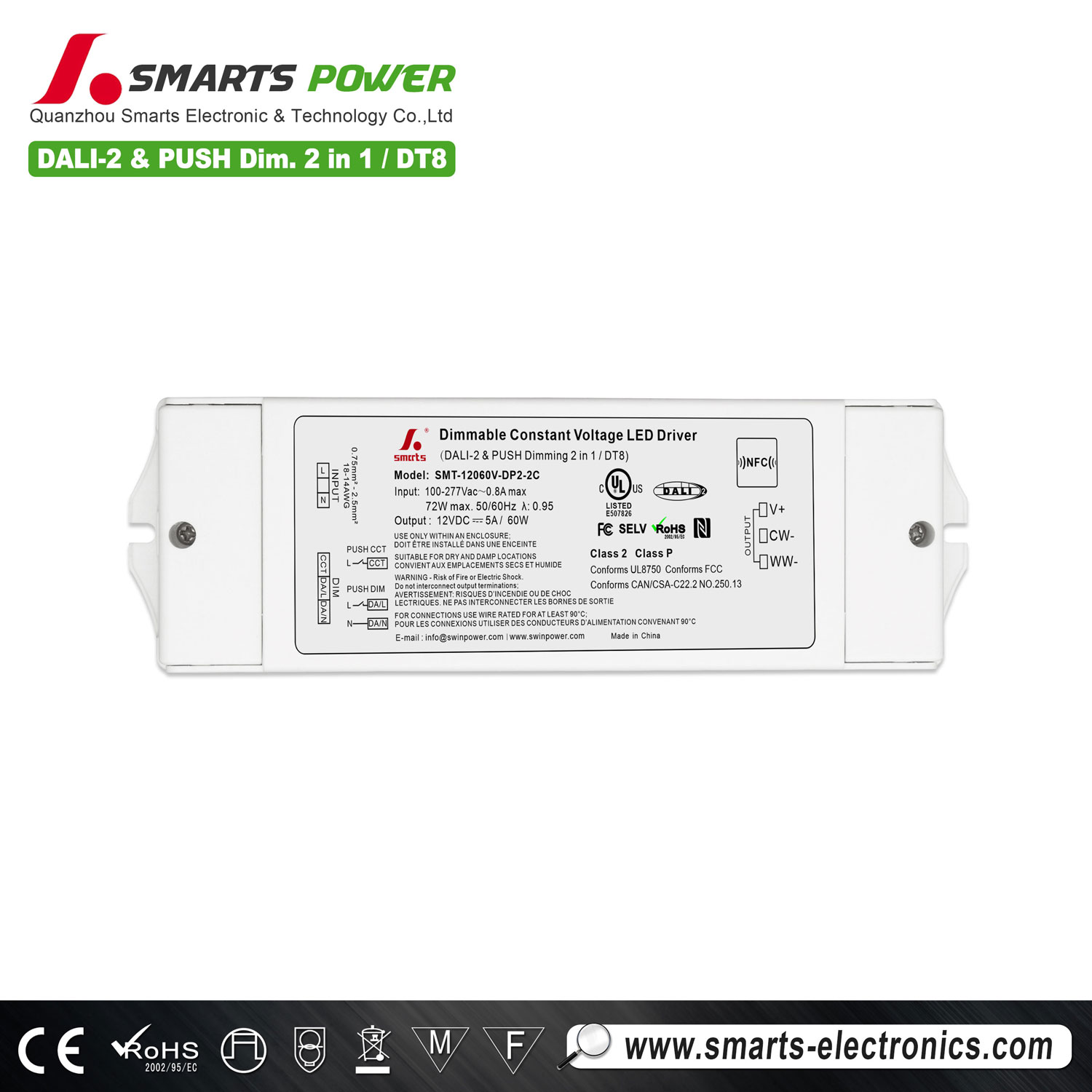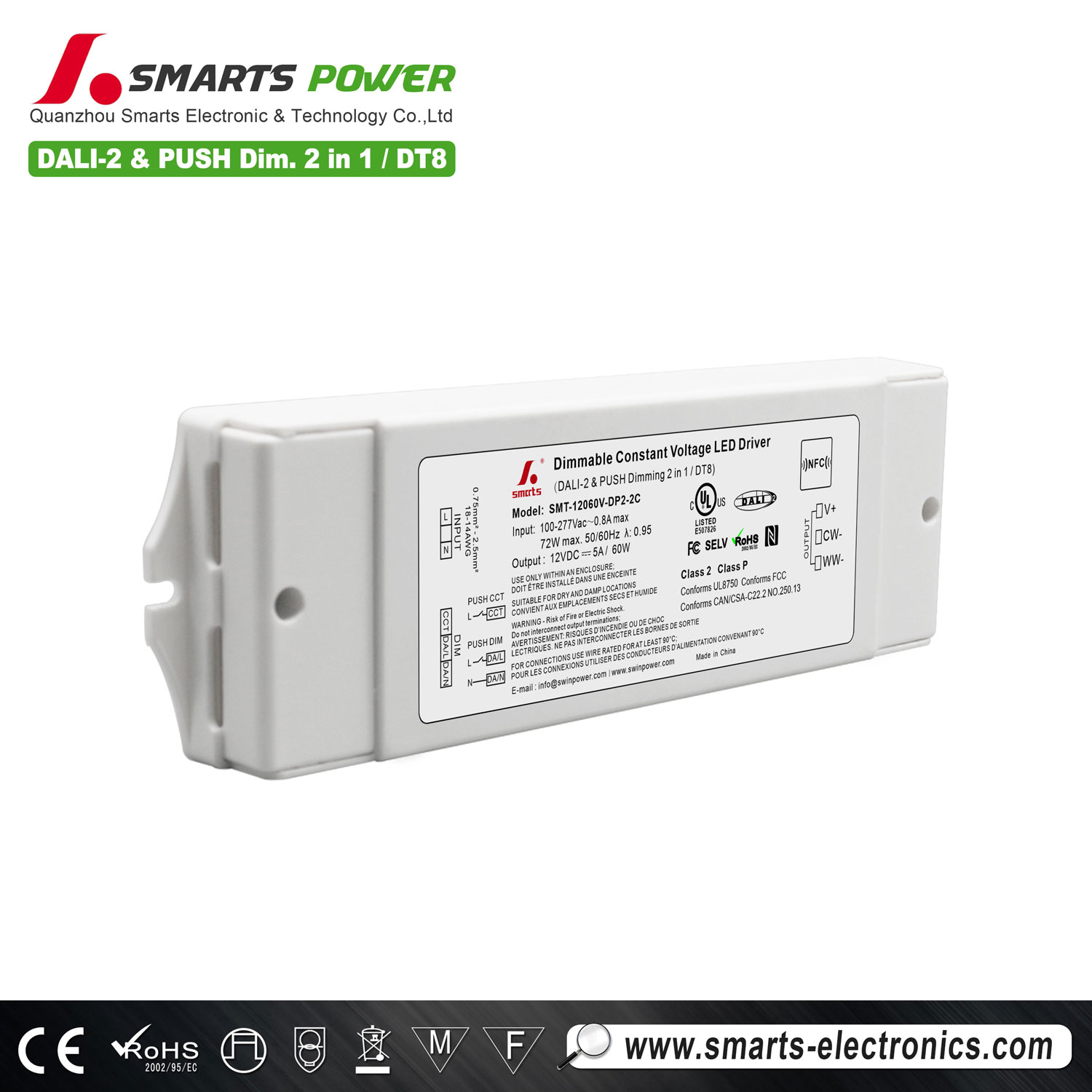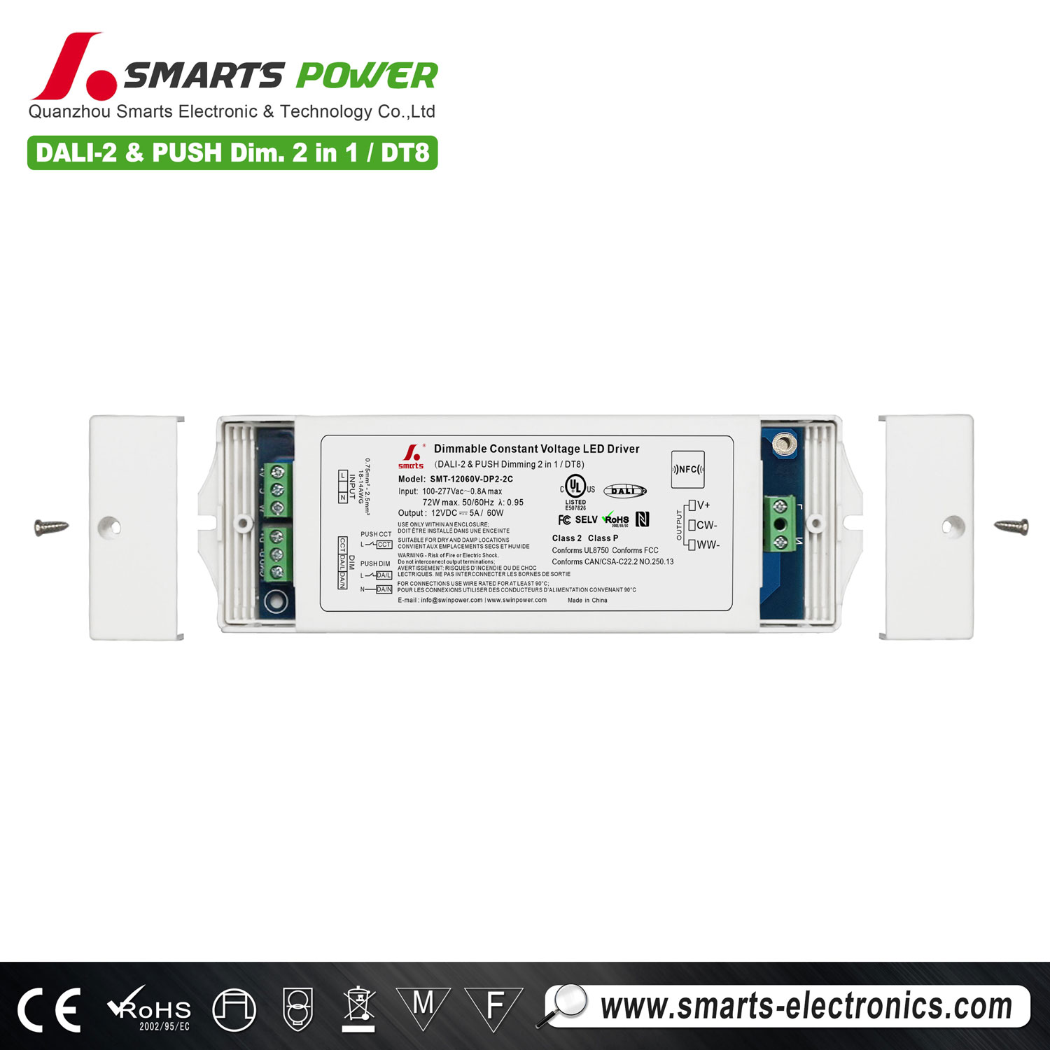 60W DALI-2 & PUSH dimmable led driver has PFC function, constant voltage working mode, efficiency up to 88.5%, through dali-2 dimming protocol IEC6 2386, plastic shell design, waterproof class IP20, suitable for indoor intelligent lighting projects