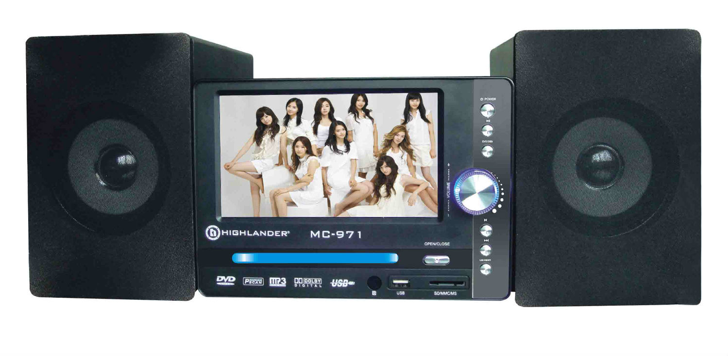 7inch 30W/2-channel/DVD Micro HiFi Component System, Modern Design with USB, WITH Bluetooth optional *Compatible with DVD, VCD, Audio CD, MP3, WMA, JPG, DivX, *7inch display, resolution 480x234 *USB slot *Built-in two channel amplifier *Output power: 15W + 15W *Coaxial/optical digital output *HDMI/DVB-T2 *SD/MMC/MS card slot optional *FM/Bluetooth optional *Progressive scan support * Component video, Composite video output.
