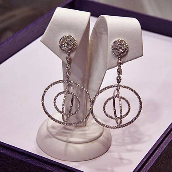 Featured is a pair of dangle ring earrings with an inter-twisted circularity design. A number of diamonds are set along the inter-twisted rings, making the earrings sparkling, appealing and yet giving a sense of elegance to users.