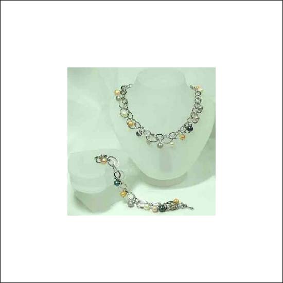 • Necklace and bracelet of cultured round fresh water pearl in Tri-circle design