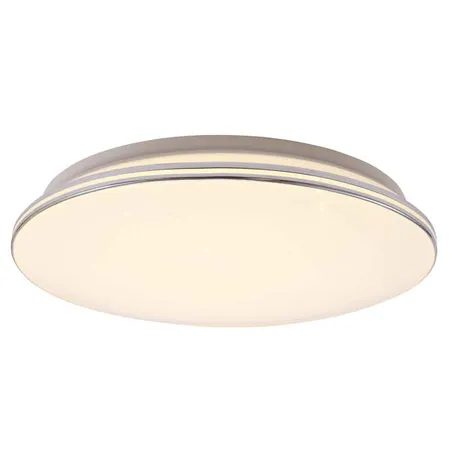 This is a round ceiling light. The lampshade is in a soft off - white color, emitting a warm light. There are silver decorative lines along the edge of the lamp body, adding a sense of refinement. The overall design is simple and modern, suitable for installation in indoor spaces such as bedrooms and living rooms for lighting and decoration.